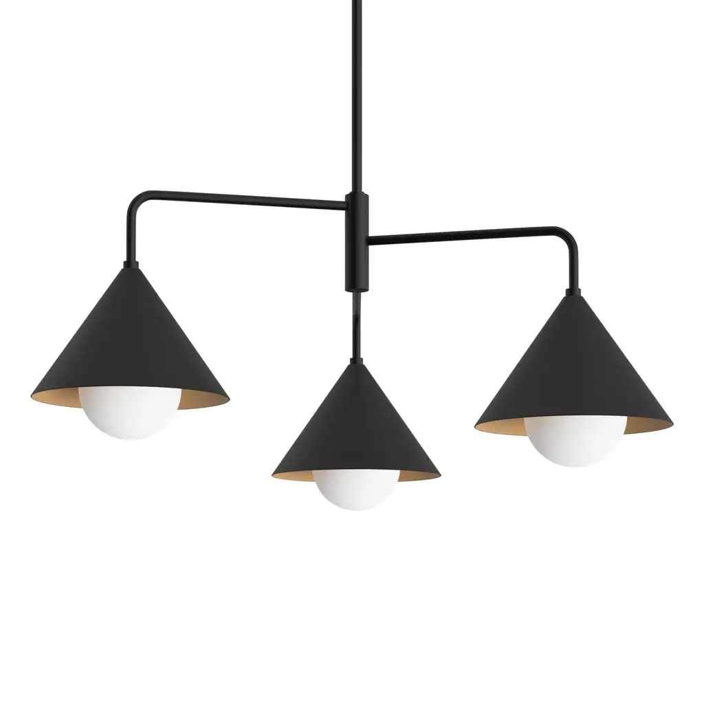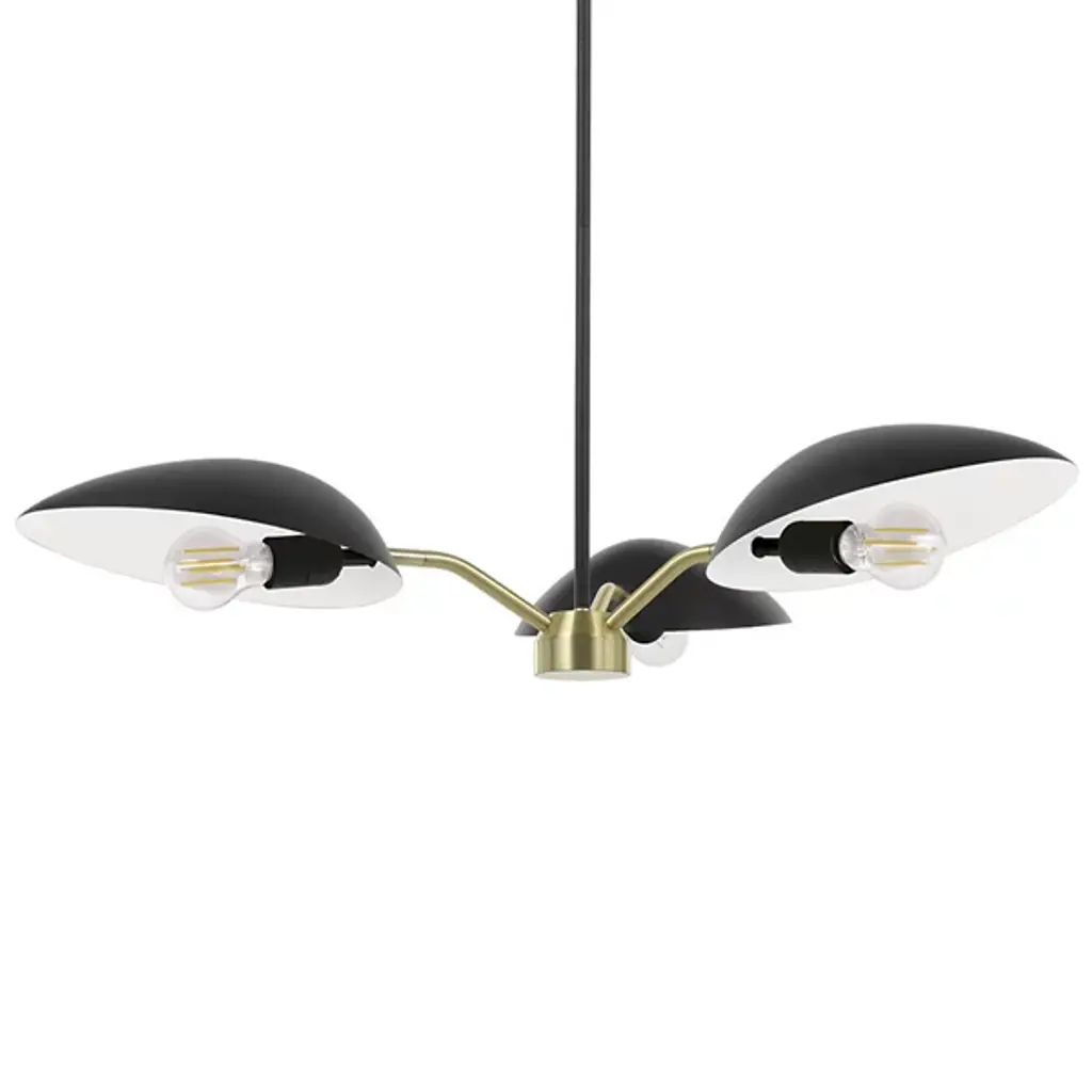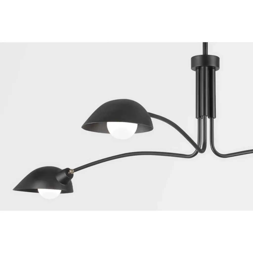 Minimalism with presence, the product has a clean, sculptured look that fills a space. Rounded shades suspend from sprawling metal arms, all in a soft black finish. The three-bulb pendant is over six-and-a-half feet in diameter. The shades rotate to create a customized lighting plan. This expansive fixture will bring stunning style to any large space.