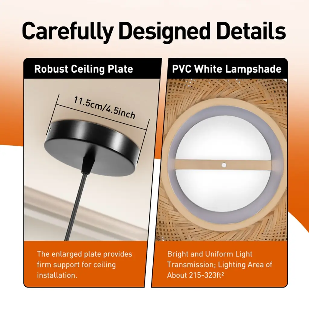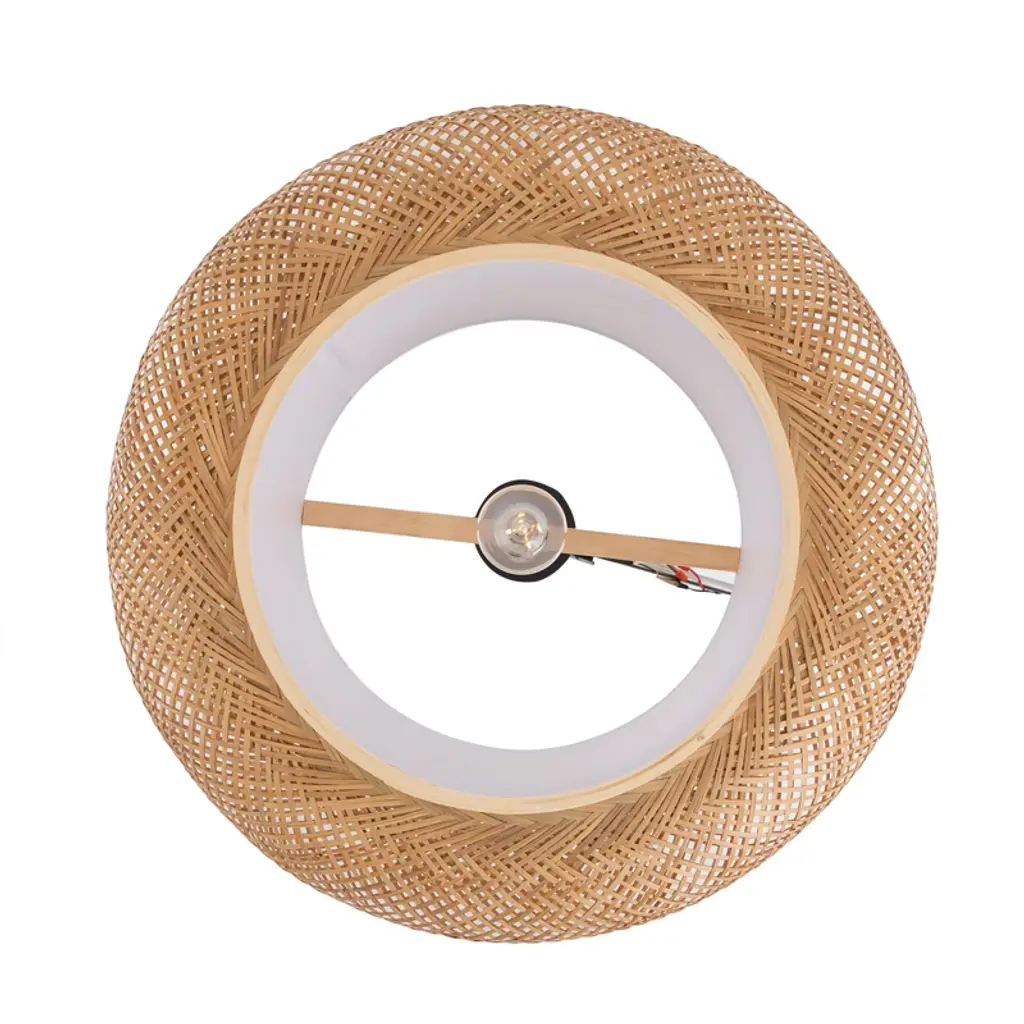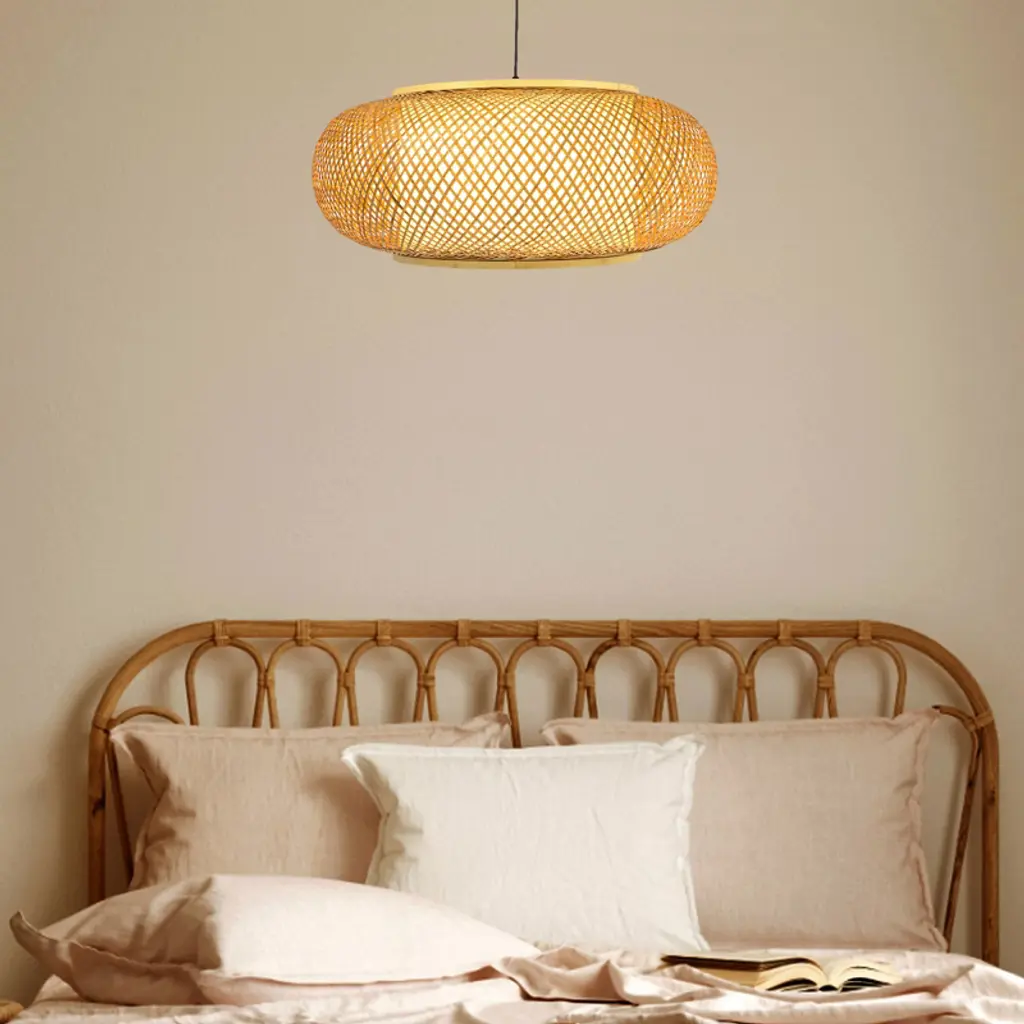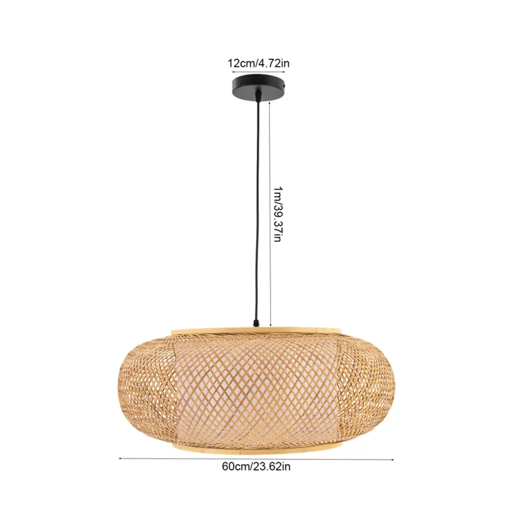 This rustic bamboo chandelier brings a unique, warm ambiance to any space. Hand-woven from natural, durable bamboo and featuring a sturdy iron frame, its cage-like design projects beautiful, soft patterns onto the ceiling, creating a relaxed and inviting atmosphere. The adjustable sling (up to 39.4 inches) accommodates various ceiling heights, while the open bottom makes bulb replacement and cleaning simple. Compatible with any standard E26 bulb (not included, max 60W), this fixture is perfect for adding a touch of farmhouse charm to living rooms, bedrooms, dining areas, or even covered porches. Details E26 Lamp Holder: The standard E26 lamp holder can be compatible with incandescent lamps, fluorescent lamps, LED lamps, halogen lamps, and other lamp types for easy bulb replacement. Robust Ceiling Plate: The enlarged ceiling plate (4.5inch) provides firm support for ceiling installation. PVC White Lampshade: PVC white lampshade with bright and uniform light transmission provides ample lighting for your environment of about 215-323ft². Specifications Material: Bamboo, Iron, Copper, PVC Color: Rattan Yellow Process: Hand-woven, High-temperature Baking Paint Style: Rustic, Farmhouse Shape: Cage Type Chandelier Type: Bamboo Art Chandelier Mounting Type: Ceiling Mount Indoor/Outdoor Usage: Indoor Light Direction: Down Lighting Light Source: 1* E26 Bulb (Not Included) Voltage: 110-220V Max. Bulb Power: 60W Efficiency: E EU Energy Efficiency Labeling Class: A++ to E Applicable Area: 20-30m²/215-323ft² Sling Height Adjustable Range: 1m/39.4inch Ceiling Plate Diameter: 11.5cm/4.5inch Lamp Shade Height: 20cm/7.9inch Lamp Shade Diameter: 40cm/16inch Top/bottom Opening Diameter: 23cm/9inch