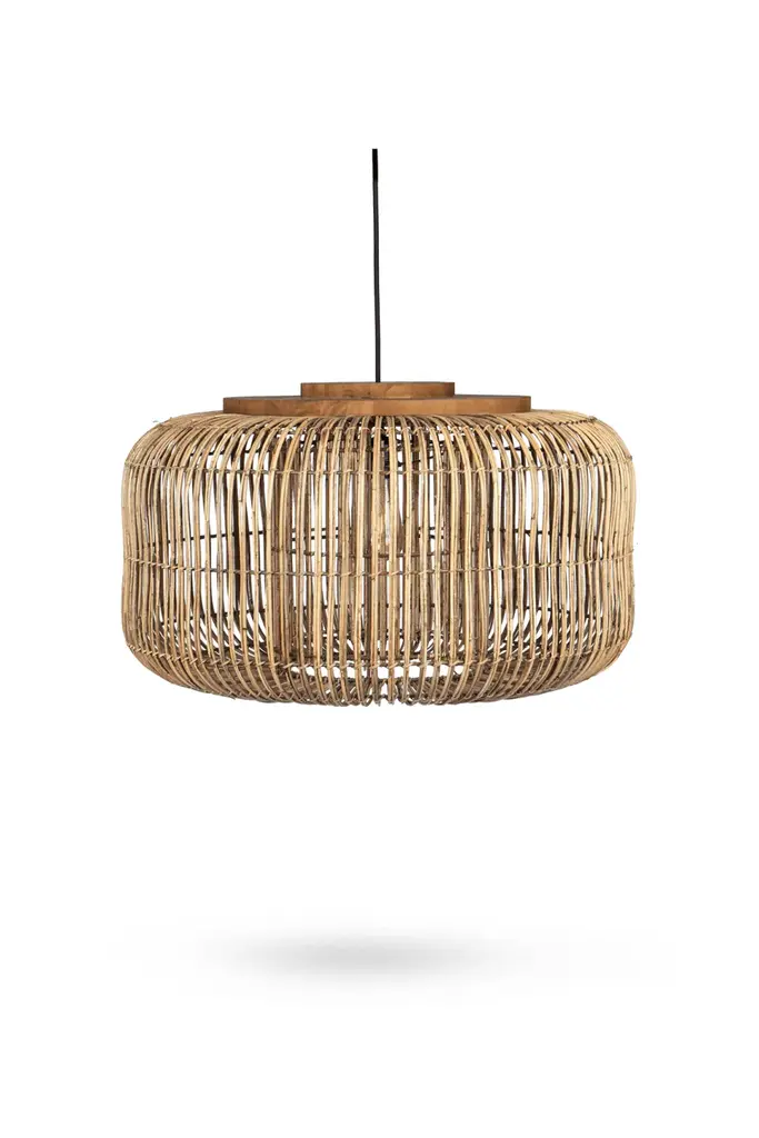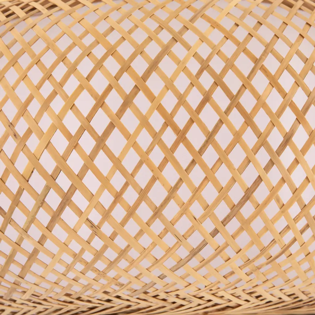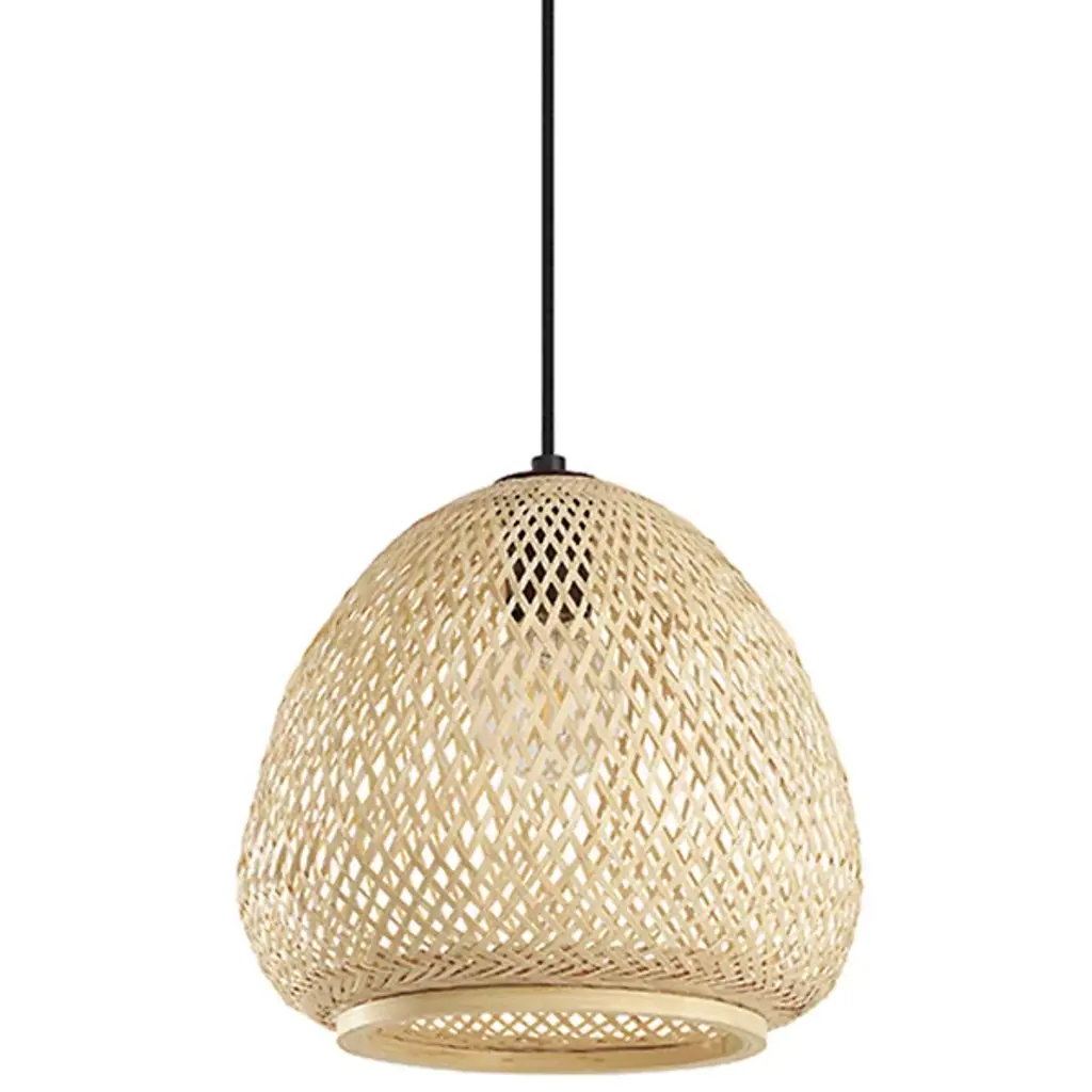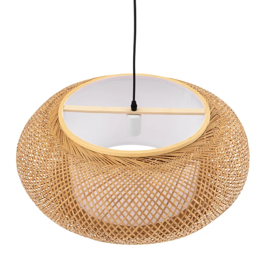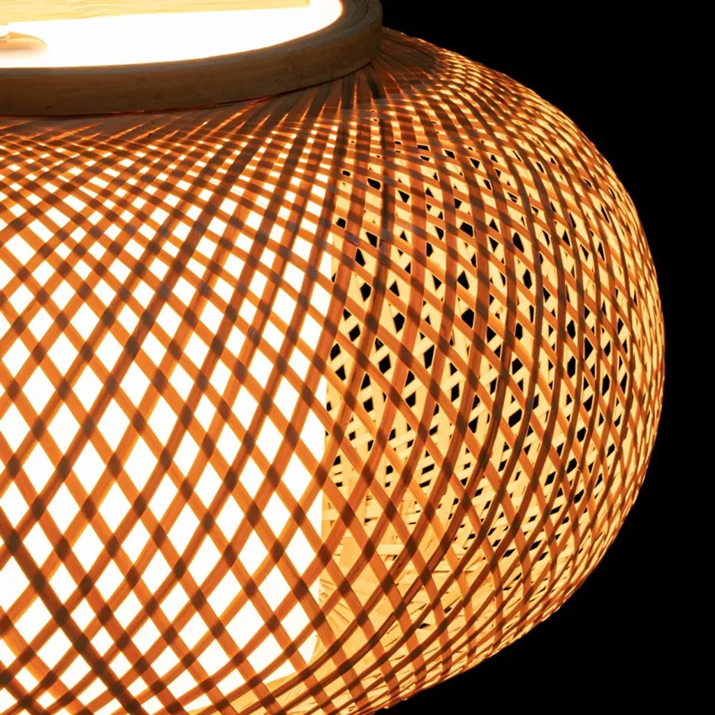 This rustic bamboo chandelier brings a unique, warm ambiance to any space. Hand-woven from natural, durable bamboo and featuring a sturdy iron frame, its cage-like design projects beautiful, soft patterns onto the ceiling, creating a relaxed and inviting atmosphere. The adjustable sling (up to 39.4 inches) accommodates various ceiling heights, while the open bottom makes bulb replacement and cleaning simple. Compatible with any standard E26 bulb (not included, max 60W), this fixture is perfect for adding a touch of farmhouse charm to living rooms, bedrooms, dining areas, or even covered porches. Details E26 Lamp Holder: The standard E26 lamp holder can be compatible with incandescent lamps, fluorescent lamps, LED lamps, halogen lamps, and other lamp types for easy bulb replacement. Robust Ceiling Plate: The enlarged ceiling plate (4.5inch) provides firm support for ceiling installation. PVC White Lampshade: PVC white lampshade with bright and uniform light transmission provides ample lighting for your environment of about 215-323ft². Specifications Material: Bamboo, Iron, Copper, PVC Color: Rattan Yellow Process: Hand-woven, High-temperature Baking Paint Style: Rustic, Farmhouse Shape: Cage Type Chandelier Type: Bamboo Art Chandelier Mounting Type: Ceiling Mount Indoor/Outdoor Usage: Indoor Light Direction: Down Lighting Light Source: 1* E26 Bulb (Not Included) Voltage: 110-220V Max. Bulb Power: 60W Efficiency: E EU Energy Efficiency Labeling Class: A++ to E Applicable Area: 20-30m²/215-323ft² Sling Height Adjustable Range: 1m/39.4inch Ceiling Plate Diameter: 11.5cm/4.5inch Lamp Shade Height: 20cm/7.9inch Lamp Shade Diameter: 40cm/16inch Top/bottom Opening Diameter: 23cm/9inch