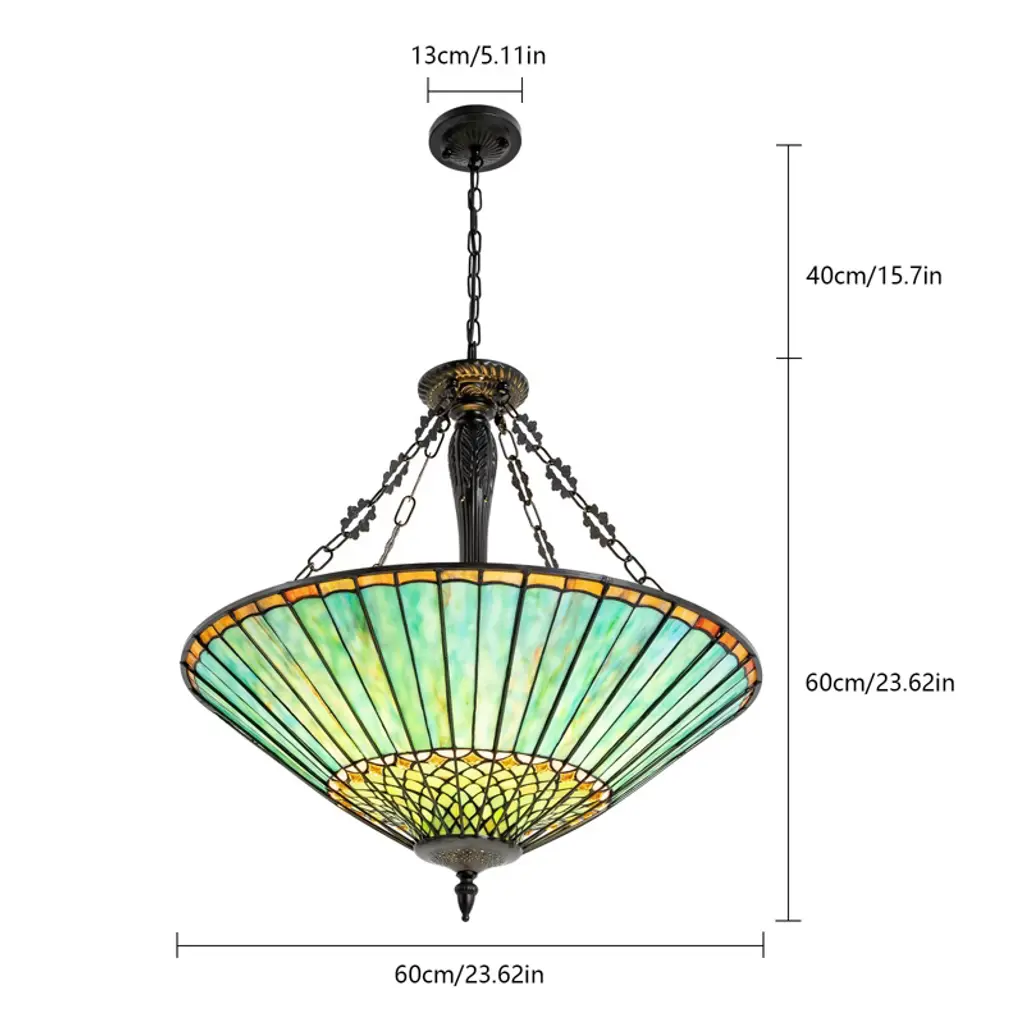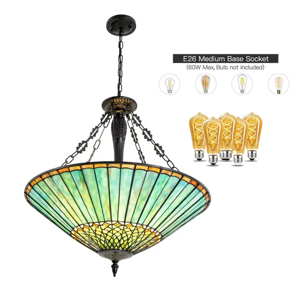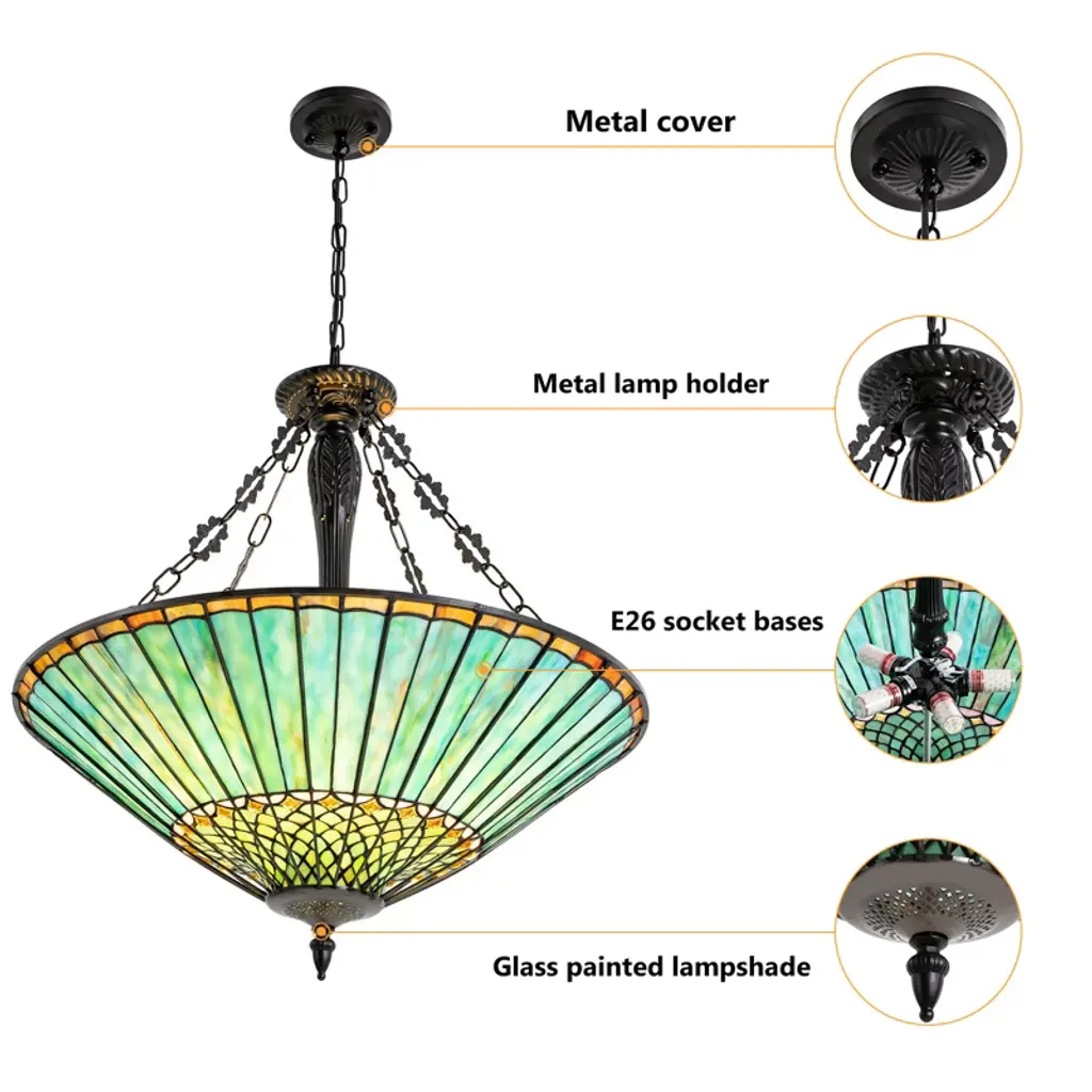 The Tiffany style pendant light with its gorgeous colors and classic conic shape is not only an excellent tool to light up your room but also embellish your room with unique and beautiful elements. With exquisite workmanship and durable stained glass, it is not easy to fade. You can install 5 E26 bulbs yourself such as incandescent and LED bulbs to create different lighting atmospheres and express your unique taste. Specifications Style: Tiffany Color: Emerald Green (Light Off) Material: Stained Glass, Zinc Alloy Process: Stoving Varnish, Cutting, Polishing, Tin-soldering, Coating Technology Control Method: Reserved Wall Switch Power Source: Corded Electric Voltage: 110V Efficiency: E Light Source: 5*E26 Bulbs(Not Included) Bulb Types: Energy-saving Bulb, Incandescent Bulb, LED Max. Single Bulb Power: 80W Illumination Area: 15-20m²/ 161.45-215.27ft² Suitable Floor Height: 2.8-3.5m/9.18-11.48ft Adjustable Height: 50-100cm/19.68-39.37inch Chain Length: About 40cm/15.7inch Product Overall Height: 100cm/39.37inch Shade Diameter: 60cm/23.62 inch Base Diameter: 13cm/5.11inch