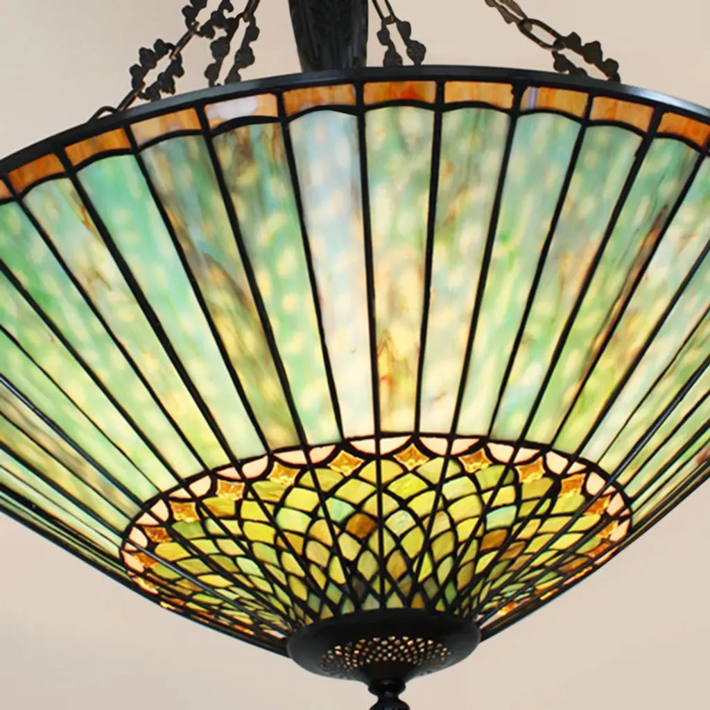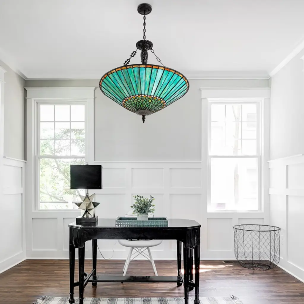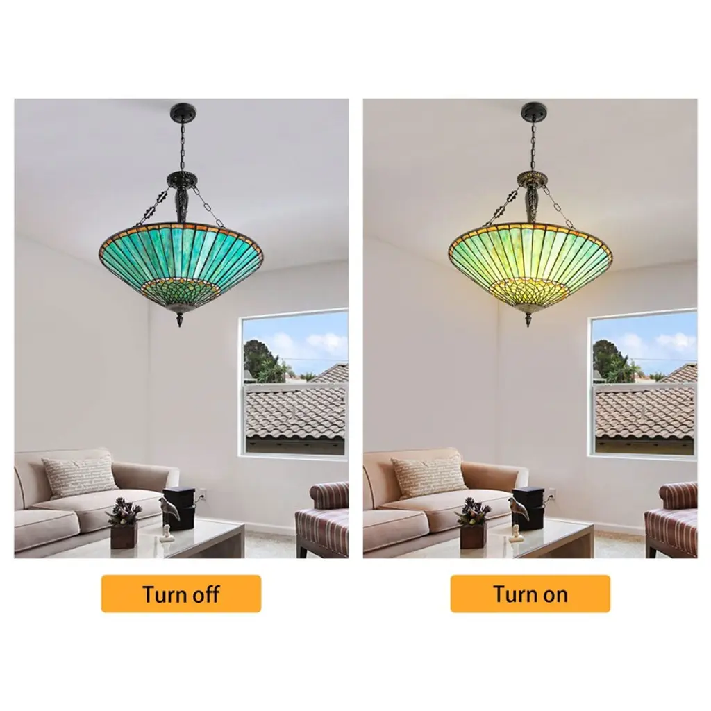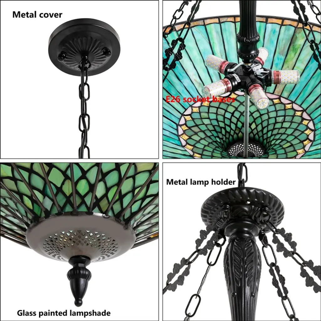 The Tiffany style pendant light with its gorgeous colors and classic conic shape is not only an excellent tool to light up your room but also embellish your room with unique and beautiful elements. With exquisite workmanship and durable stained glass, it is not easy to fade. You can install 5 E26 bulbs yourself such as incandescent and LED bulbs to create different lighting atmospheres and express your unique taste. Specifications Style: Tiffany Color: Emerald Green (Light Off) Material: Stained Glass, Zinc Alloy Process: Stoving Varnish, Cutting, Polishing, Tin-soldering, Coating Technology Control Method: Reserved Wall Switch Power Source: Corded Electric Voltage: 110V Efficiency: E Light Source: 5*E26 Bulbs(Not Included) Bulb Types: Energy-saving Bulb, Incandescent Bulb, LED Max. Single Bulb Power: 80W Illumination Area: 15-20m²/ 161.45-215.27ft² Suitable Floor Height: 2.8-3.5m/9.18-11.48ft Adjustable Height: 50-100cm/19.68-39.37inch Chain Length: About 40cm/15.7inch Product Overall Height: 100cm/39.37inch Shade Diameter: 60cm/23.62 inch Base Diameter: 13cm/5.11inch