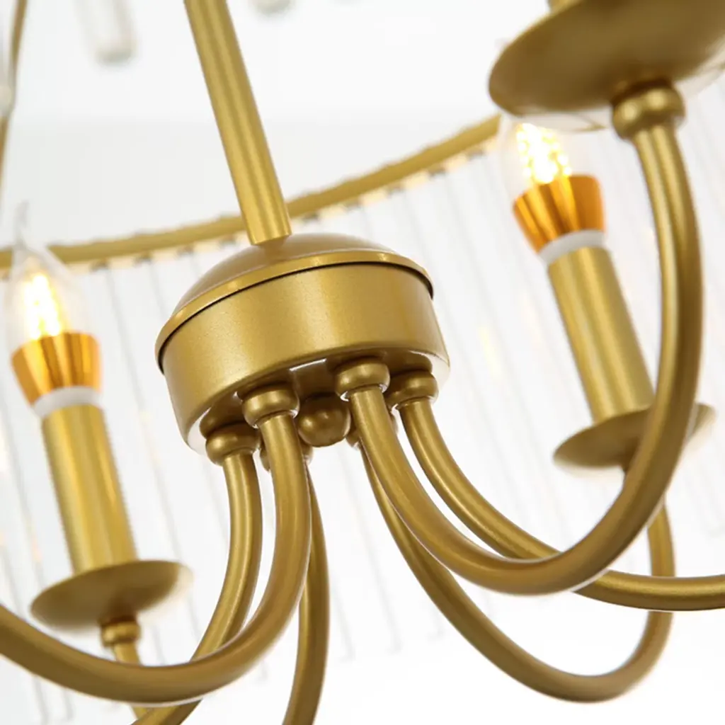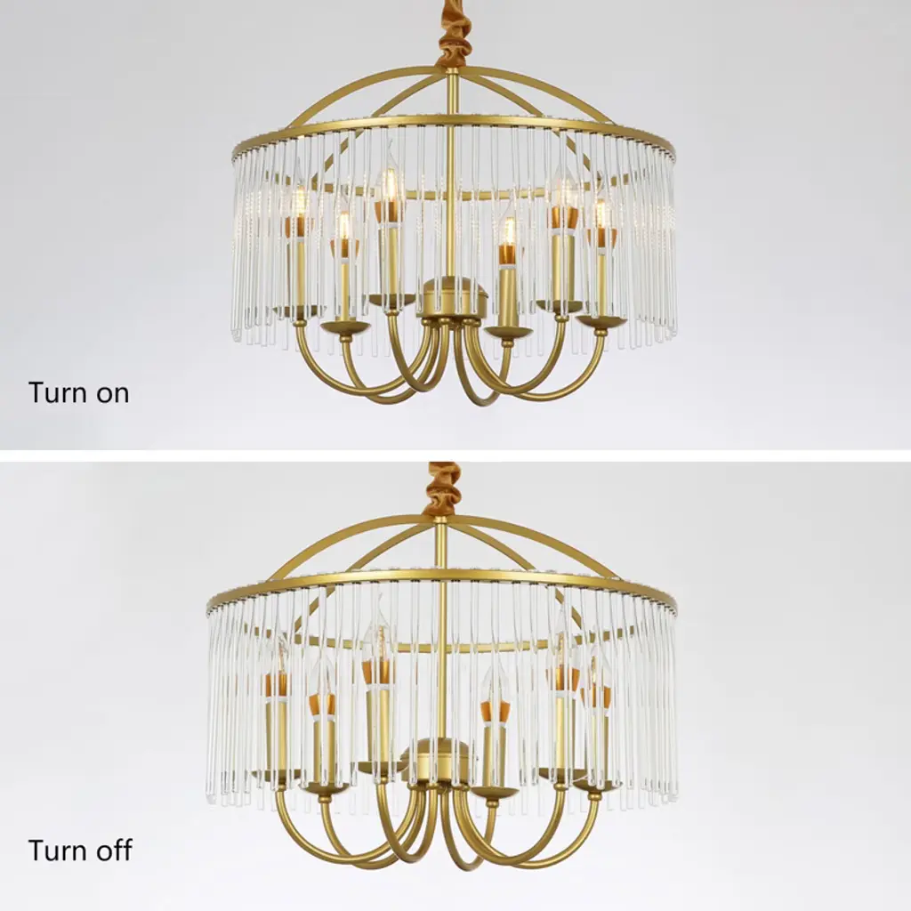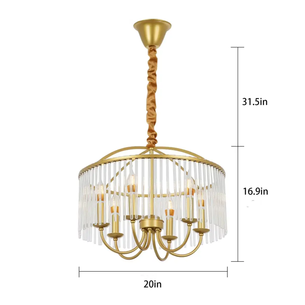 Elevate your home with this stunning 6-light modern pendant light, featuring a beautiful gold finish and crystal decor that creates an elegant, romantic ambiance. Built to last from high-quality, rust-proof metal and sandblasted glass crystal, it offers both durability and a unique, modern style. The fixture provides excellent, customizable lighting with its standard E12 lamp holders, which support various or dimmable bulbs (not included). Designed for simple installation and easy cleaning, it includes an adjustable hanging wire to fit your space. Ideal for dining rooms, kitchens, living areas, and more, this pendant light is the perfect blend of sophisticated design and practical functionality, making it an ideal gift or a beautiful addition to any home. Specifications Material: Metal, Glass Crystal Process: Sandblast Style: Modern Color: Gold Mounting Type: Ceiling Mount Indoor/Outdoor Usage: Indoor Use Only Efficiency: E Control Type: Wall Switch(Not Included) Voltage: 110-130V Light Source: 6* E12 Bulbs(Not Included) Applicable Max. Bulb Power (Each): 40W Applicable Area: 10-15m²/107.64-161.46ft ² Adjustable Hanging Wire: 80cm/31.5in Product Size(D*H): 50*43cm/20*16.9in