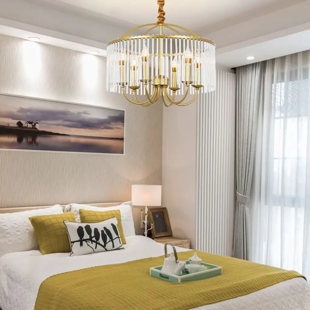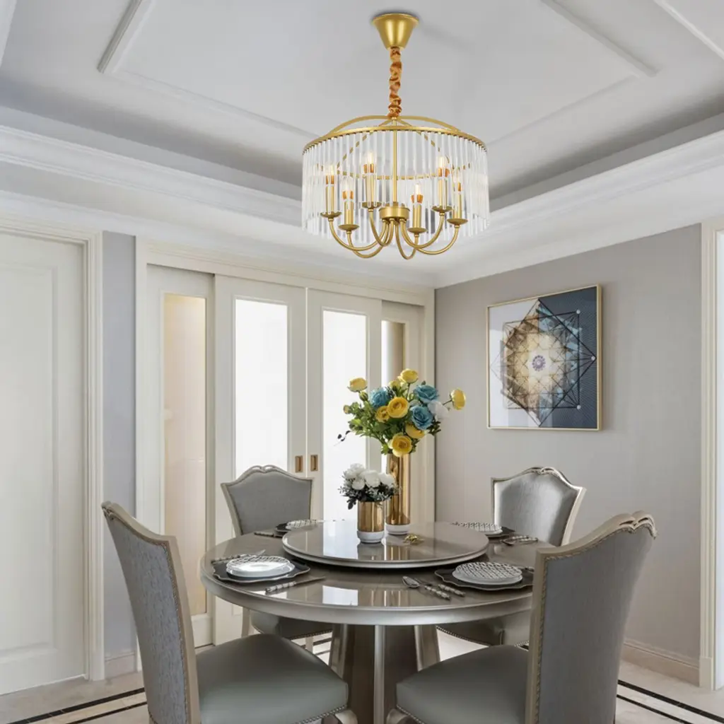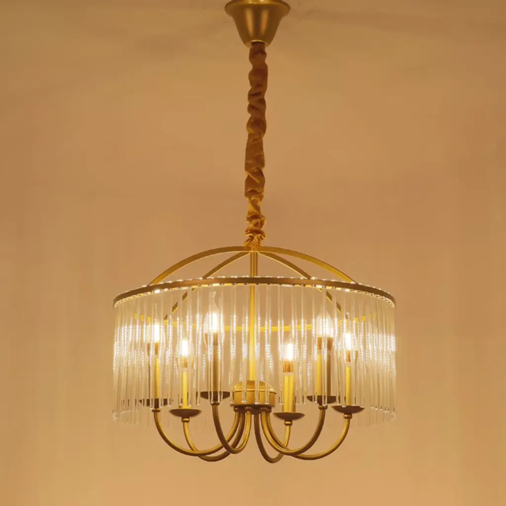 Elevate your home with this stunning 6-light modern pendant light, featuring a beautiful gold finish and crystal decor that creates an elegant, romantic ambiance. Built to last from high-quality, rust-proof metal and sandblasted glass crystal, it offers both durability and a unique, modern style. The fixture provides excellent, customizable lighting with its standard E12 lamp holders, which support various or dimmable bulbs (not included). Designed for simple installation and easy cleaning, it includes an adjustable hanging wire to fit your space. Ideal for dining rooms, kitchens, living areas, and more, this pendant light is the perfect blend of sophisticated design and practical functionality, making it an ideal gift or a beautiful addition to any home. Specifications Material: Metal, Glass Crystal Process: Sandblast Style: Modern Color: Gold Mounting Type: Ceiling Mount Indoor/Outdoor Usage: Indoor Use Only Efficiency: E Control Type: Wall Switch(Not Included) Voltage: 110-130V Light Source: 6* E12 Bulbs(Not Included) Applicable Max. Bulb Power (Each): 40W Applicable Area: 10-15m²/107.64-161.46ft ² Adjustable Hanging Wire: 80cm/31.5in Product Size(D*H): 50*43cm/20*16.9in