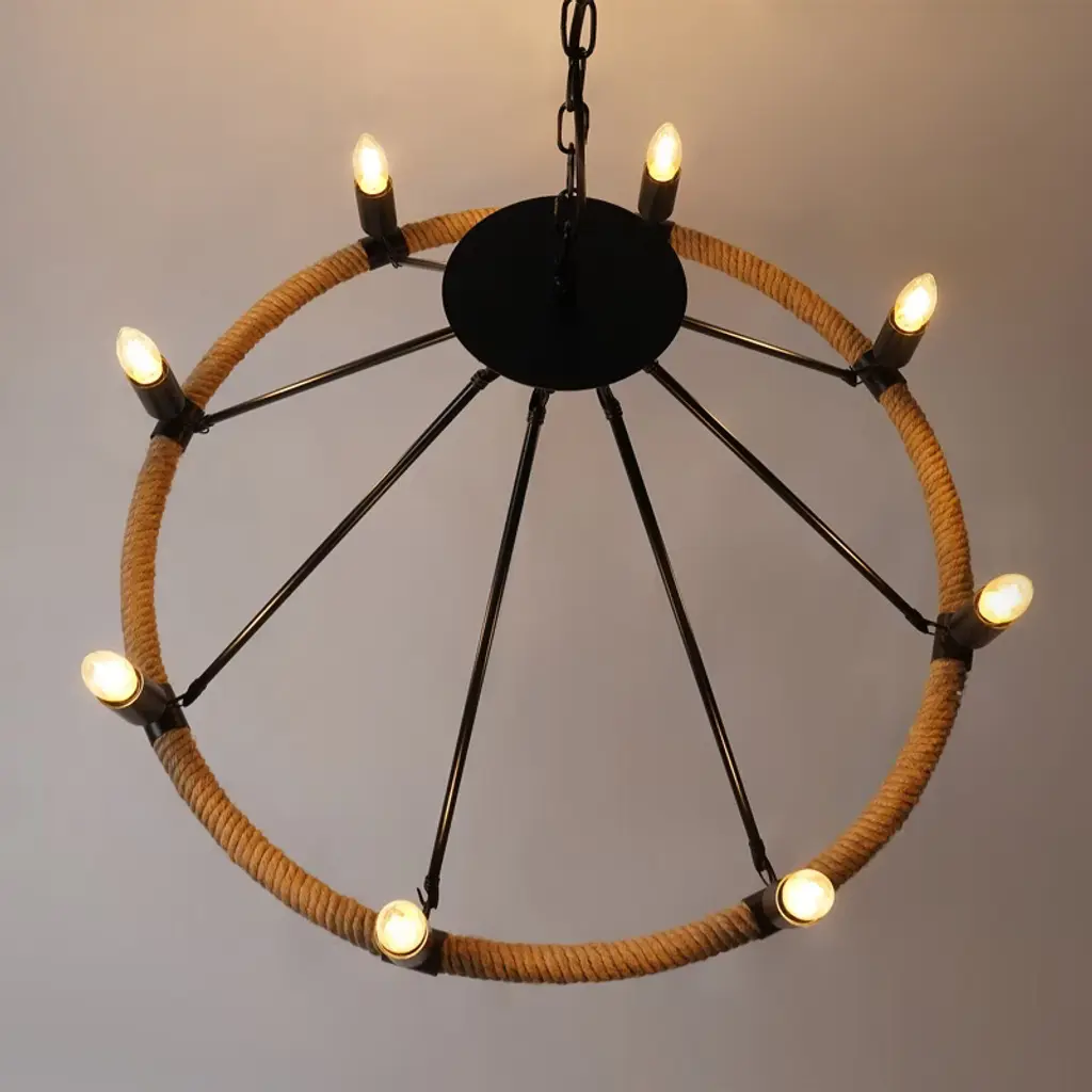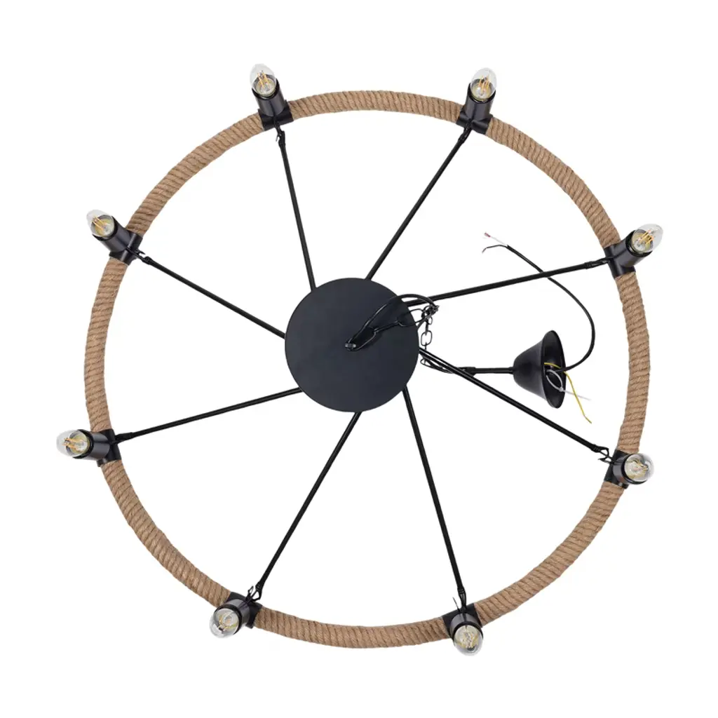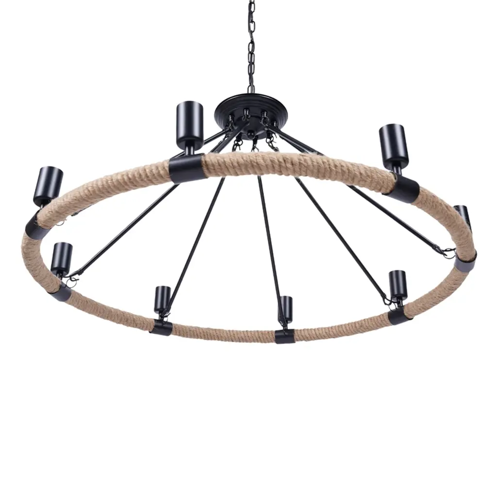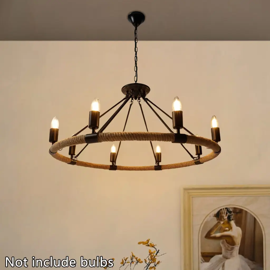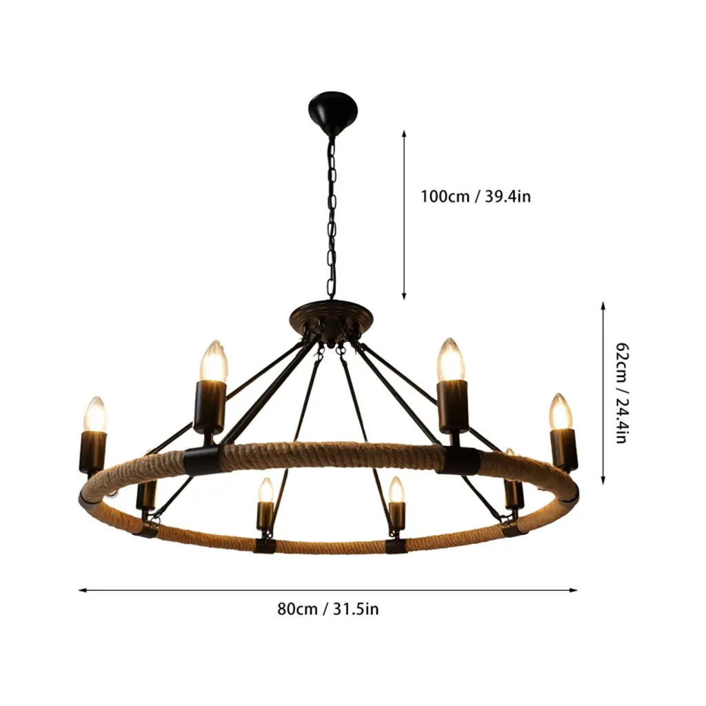 This pendant light is made of high-quality iron and hemp rope materials with iron baking paint treatment, which is sturdy and durable. It emits bright light to illuminate your life and complement your house. The unique hemp rope design and rustic style can be matched with many kinds of furniture and play a good decorative role. The freely adjustable chain can accommodate different ceiling heights. Come and bring it home! Specifications Color: Black Style: Modern, Rustic Material: Iron, Hemp Rope Efficiency: E Process: Iron Baking Paint Mount Type: Hanging Indoor/Outdoor Usage: Indoor Assembly Required: Yes Control Method: Wall Switch (Not Included) Voltage: 110V Max. Single Bulb Power: 40W Illumination Area: 12-25㎡/129.17-269.1ft² Suitable Room Height: About 3.5m/11.48ft 6-Light Adjustable Height: 50cm/19.68in Light Source: 6* E26 Bulbs(Not Included) Gross Weight: 4kg/8.82lbs Product Diameter: 59.9cm/23.6in Overall Product Height: 110cm/43.31in 8-Light Adjustable Height: 100cm/39.4in Light Source: 8* E26 Bulbs(Not Included) Gross Weight: 4.85kg/10.69lbs Product Diameter: 80cm/31.5in Product Height: 62cm/24.4in