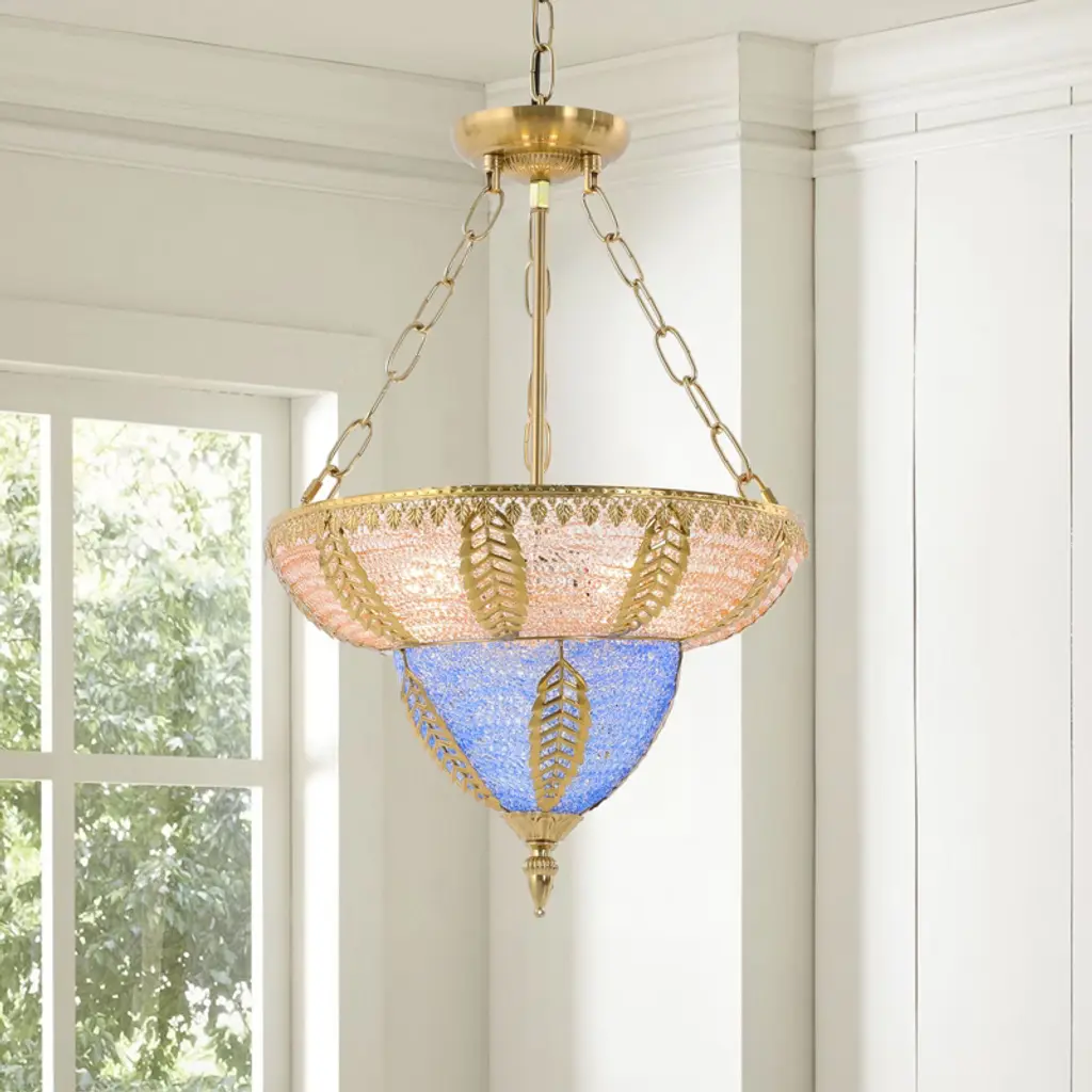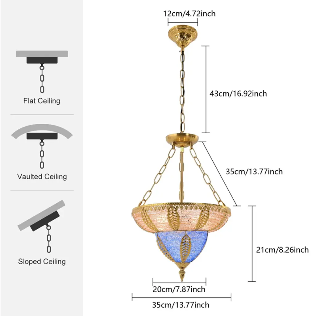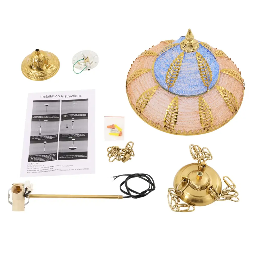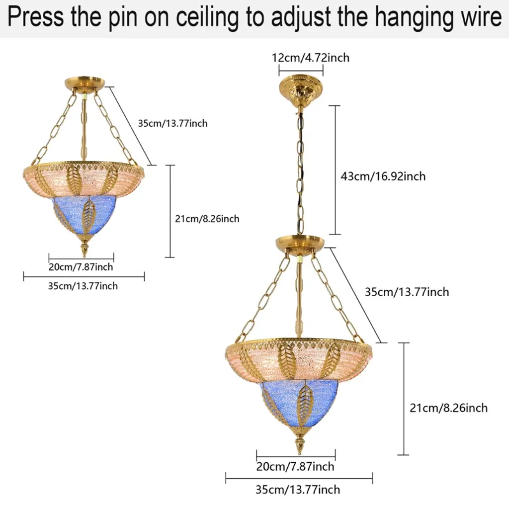 This Bohemian-style pendant light, crafted from high-grade PC, iron, and finished with high-temperature baking paint, offers a blend of warmth and vitality to any space. With its hand-welded orange and blue lampshade, golden leaf decorations, and 3-light head design, it provides even, soft lighting without glare, suitable for various indoor settings. Specification Mount Type: Ceiling Mount Assembly Required: Yes Color: Orange, Blue, Gold Style: Bohemian Material: Iron, PC Process: High-temperature Baking Paint, Hand-welding Light Source: 3* E26 Bulbs (Not Included) Switch Type: Wall Switch (Not Included) Single Bulb Power: 25W Voltage: 90-260V Power Source: Wired Efficiency: E Applicable Room Height: 3m/9.84ft Irradiation Area: 15m²/161.46ft² Base Diameter: 12cm/4.72in Chain Length: 43cm/16.92in, 35cm/13.77in Chain Adjustment Range: 0-40cm/0-15.75in Lampshade Diameter: 35cm/13.77in, 20cm/7.87in Lampshade Height: 21cm/8.26in