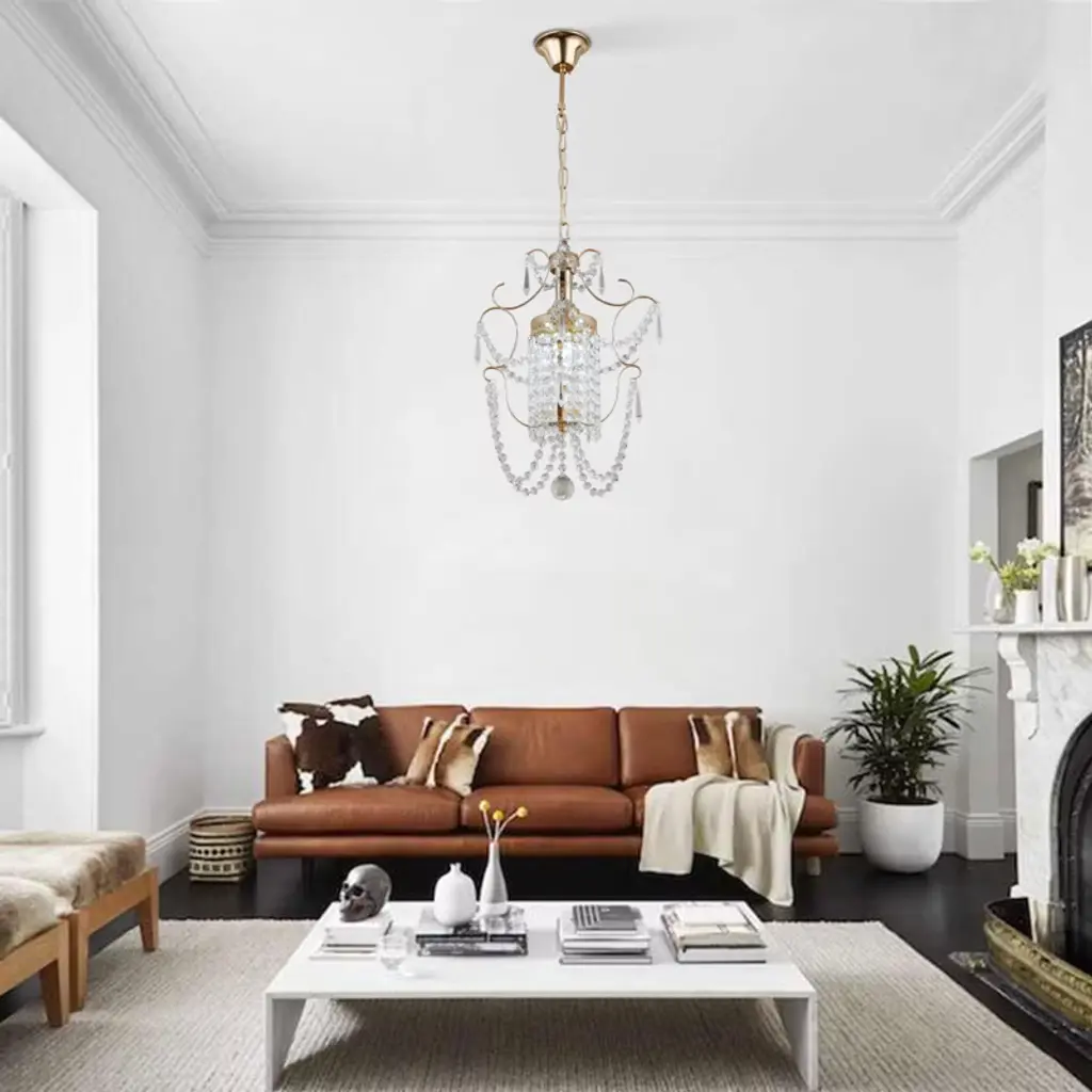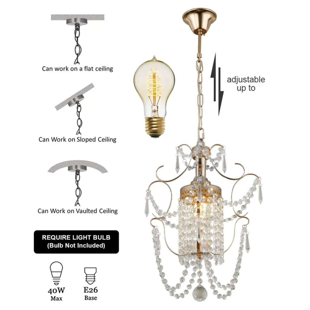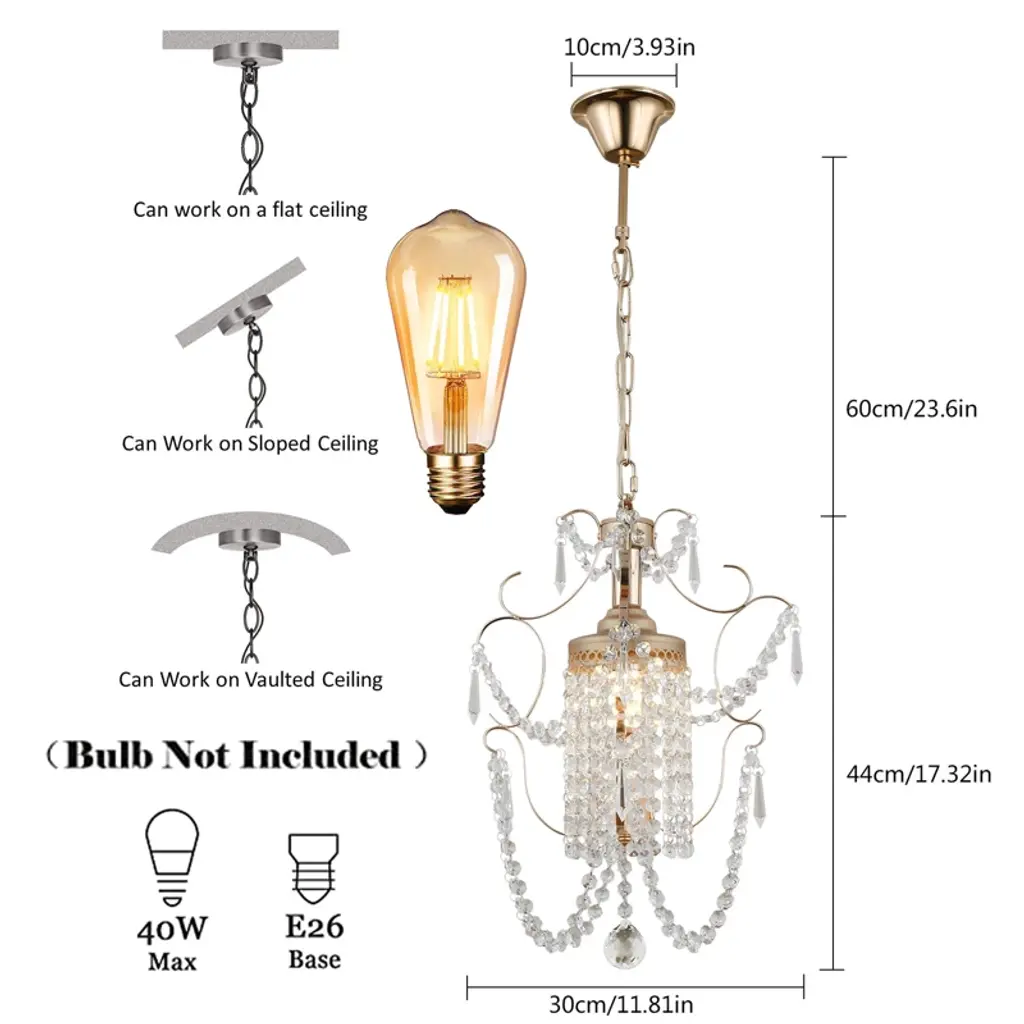 Elevate your home with this stunning crystal chandelier, a perfect blend of luxury and modern elegance. Constructed from premium hardware and sparkling K9 crystals, it refracts light into a dazzling, star-like display, transforming any room into a glamorous space. The adjustable chain allows for flexible installation on various ceiling heights, making it an ideal centerpiece for dining rooms, living rooms, or foyers. Specification Material: Hardware, K9 Crystal Process: Electroplating Color: Gold Style: Modern Indoor/Outdoor Usage: Indoor Assembly Required: Yes Control Method: Wall Switch(Not Included) Mount Type: Ceiling Mount Efficiency: E Voltage: AC 95-120V Light Source: 1* E26 Bulb (Not Included) Max. Bulb Power: 25W Illumination Range: 15 m²/161.46 ft² Chain Length: 60cm/ 23.6 in(Adjustable) Base Diameter: 10cm/3.93 in Lamp Boay Size(D*H): 30*44cm/11.81*17.32 in