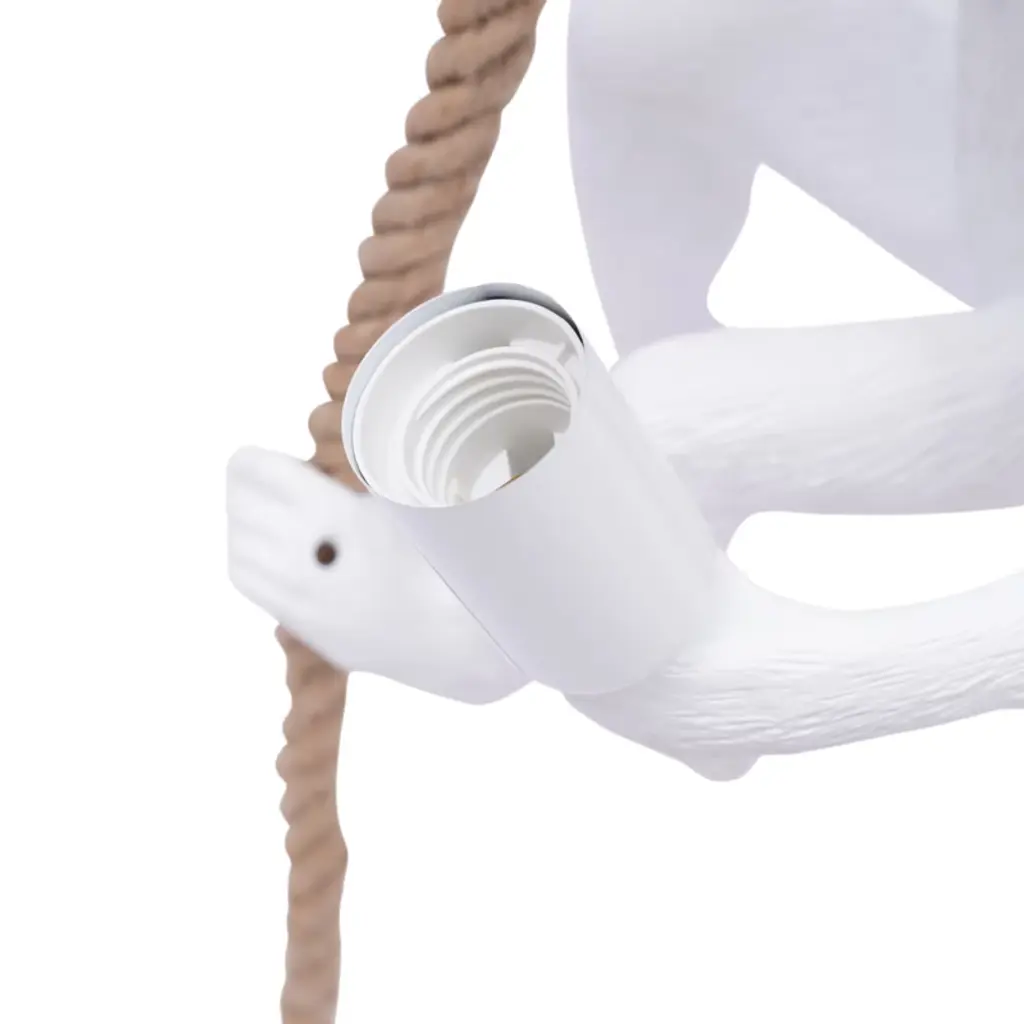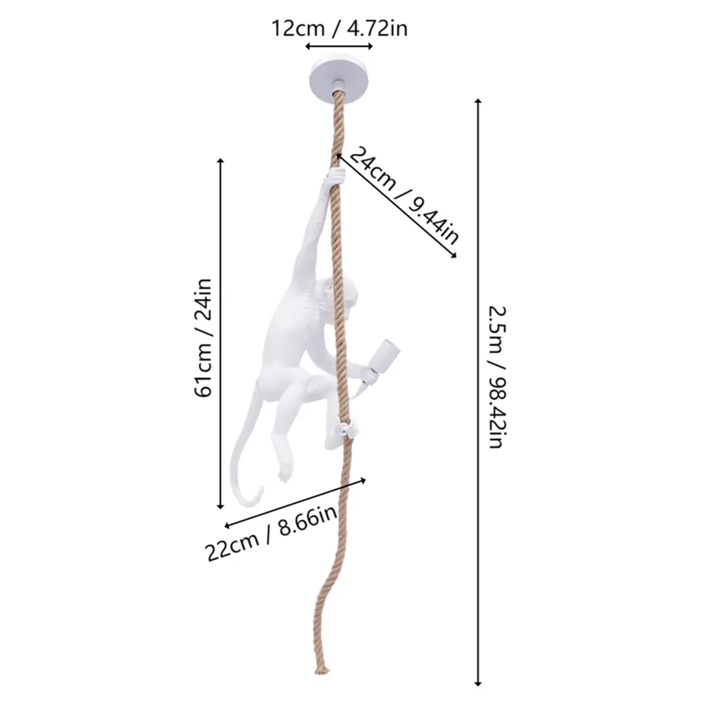 This lifelike monkey pendant light is a unique decoration in your elegant room. It is made of high-quality material, which is sturdy and durable. It is painted and has a long service life. A high-quality light source creates a peaceful and gentle atmosphere for you, relieving your fatigue throughout the day. Specification Shape: MonkeyMartial: Resin, Hemp RopeProcess: Spray PaintColor: WhiteStyle: ModernLighting Method: UplightSwitch Style: Push ButtonLight Fixture Form: ChandelierEfficiency: EPower: 40WVoltage: 110VPower Source: Corded ElectricIndoor/Outdoor Usage: IndoorLight Source Type: 1*E26 (Not Included)Illuminated Area: 10-15㎡/107.64-161.46ft²Mounting Type: Hanging Mounting, Semi-flush MountingMonkey Size(H*W): 61*22cm/24*8.67inchBase Diameter: 12cm/4.72inchLength of Hemp Rope: 2.5m/8.2ft