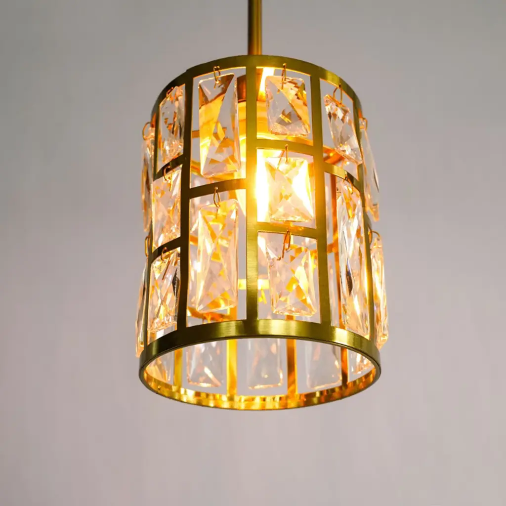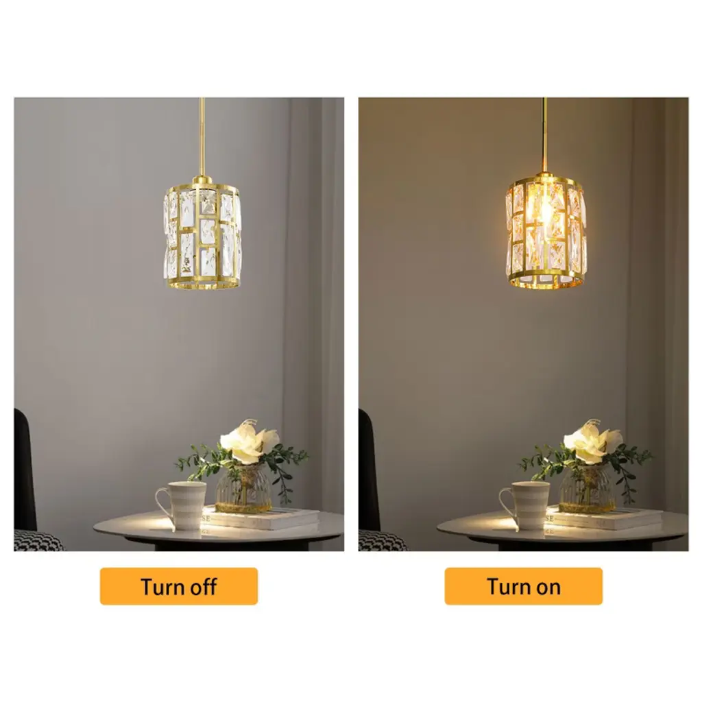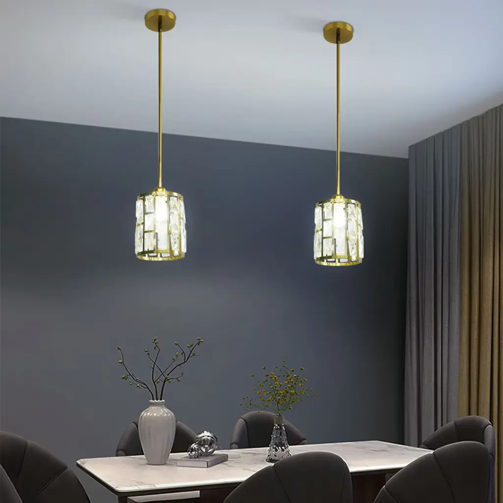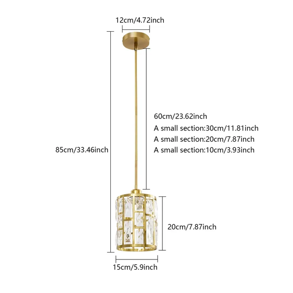 Elevate your interior with this modern gold pendant light, a perfect fusion of luxury and functionality. Expertly crafted from high-grade iron with a polished and electroplated finish, it offers exceptional rust and wear resistance, ensuring long-lasting durability. The striking golden frame, adorned with clear pendants and a sleek column lampshade, casts a captivating glow that enhances any room's ambiance. Designed with versatility in mind, it includes three adjustable suspension rods (3.93", 7.87", and 11.81") to accommodate various ceiling heights and lighting preferences. Compatible with standard E26 bulbs (not included), it supports dimmable functionality when paired with compatible dimmers and bulbs. Installation is quick and hassle-free, thanks to its simple construction and complete accessories. The sturdy 4.72-inch base ensures secure mounting, while its elegant design makes it an ideal gift. Perfect for living rooms, bedrooms, dining areas, and more, this pendant light adds a touch of sophistication to any indoor space.