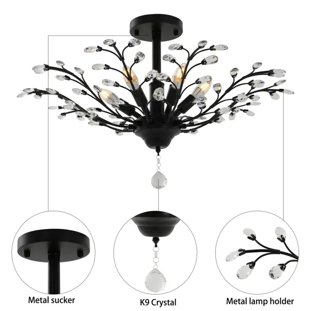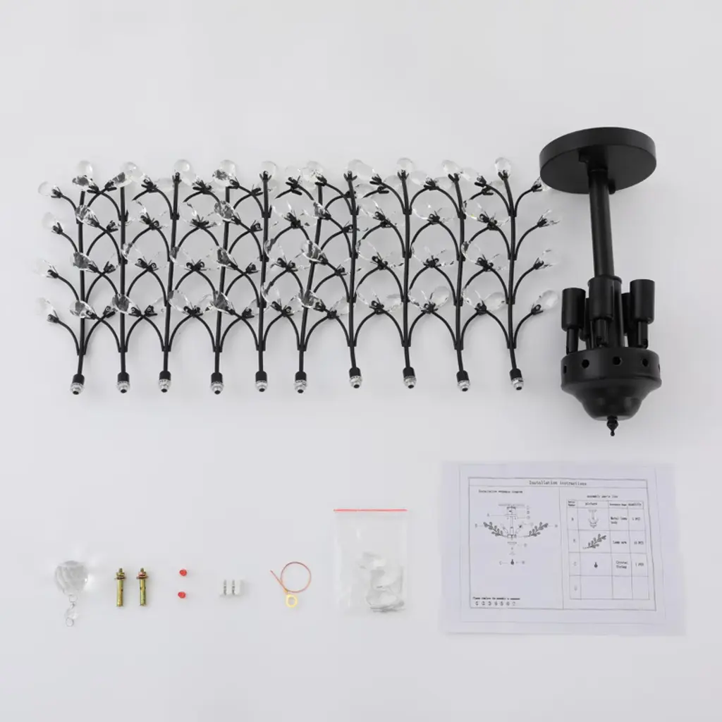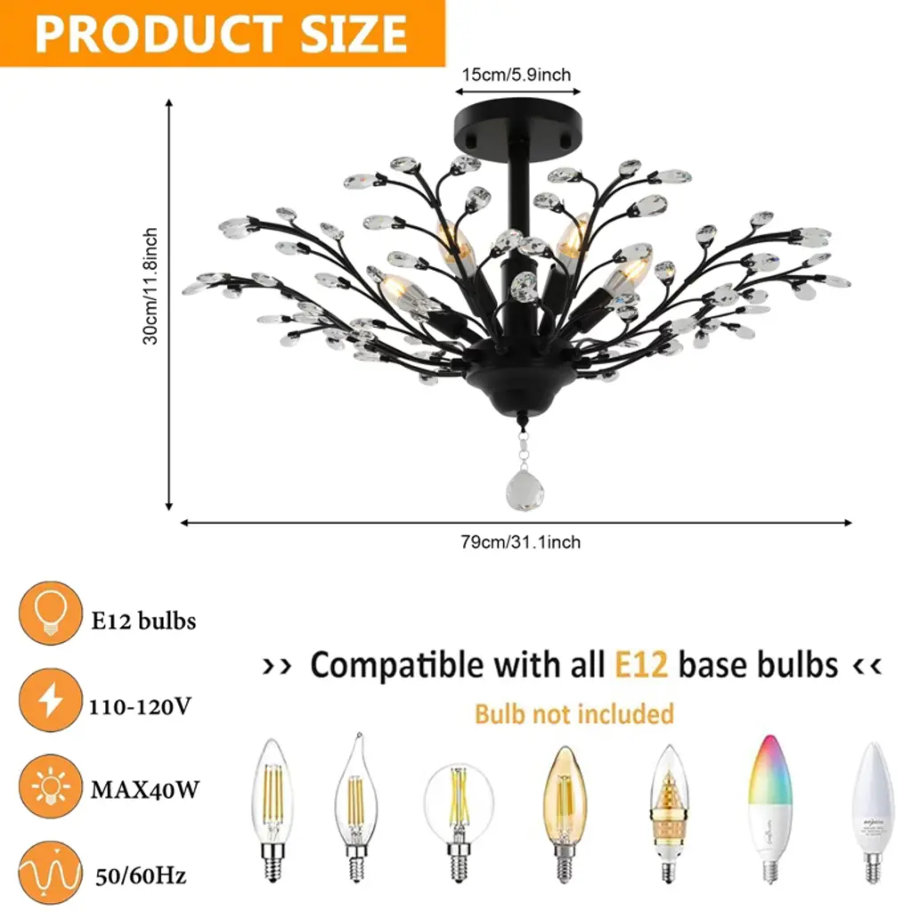 This vintage-inspired crystal chandelier blends elegance and versatility, adding a touch of romance to any space. Its black branch-like frame and sparkling crystals create a beautiful play of light, while the five E12 bulb sockets (bulbs not included) let you customize the ambiance. Made from durable, rust-resistant materials, it’s designed for long-lasting beauty. The semi-flush mount design ensures easy installation, making it perfect for living rooms, dining areas, bedrooms, or even cafes and hotel lobbies. A stylish yet practical lighting solution, it’s also easy to clean and maintain. Specification Color: Black Mount Type: Ceiling Mounted Assembly Required: Yes Efficiency: E Voltage: 110V Power Source: Cord-Electric Installation Type: Semi Flush Mount Indoor/Outdoor Usage: Indoor Use Only Light Fixture Form: Pendant Light Source: 5*E12 Bulbs(Not Included) Light Body Size(D*H): 79*30cm/31.1*11.81in Base Diameter: 15cm/5.9in Notes 1. Please check the size carefully before ordering. Please prepare 5* E12 bulbs yourself. 2. It is normal that the expansion screw will blow up after the force is applied. 3. Please wear electric insulation gloves (not included) and avoid scratching the surface of the light plate and the electric wire when installing. Please make sure that the power supply has been cut off before installation, and conduct a power test before installation. To ensure your safety, we recommend that two people especially have an electrical license install this pendant light together. 4. Please allow the slight color difference caused by the shooting light and 1-3cm error due to manual measurement, and make sure you do not mind before you order.