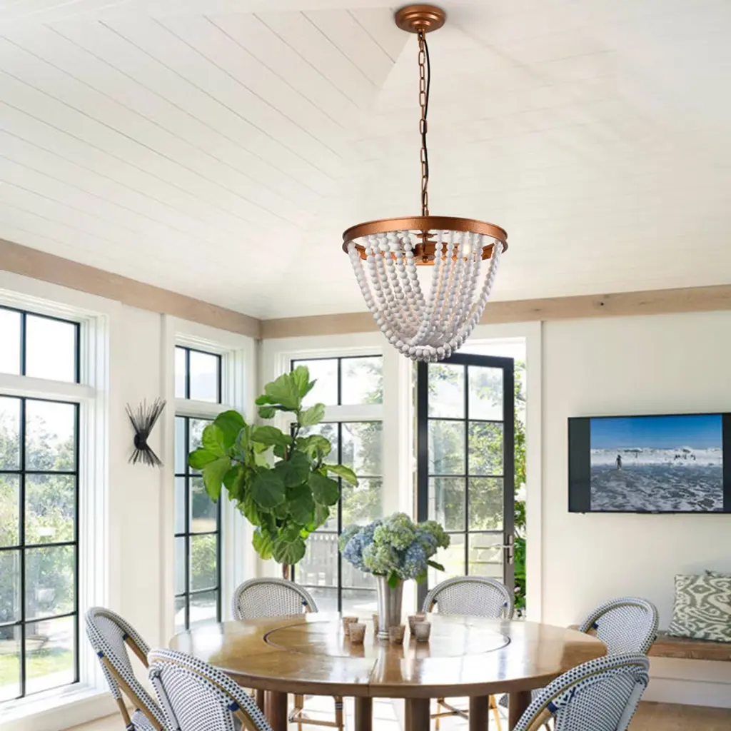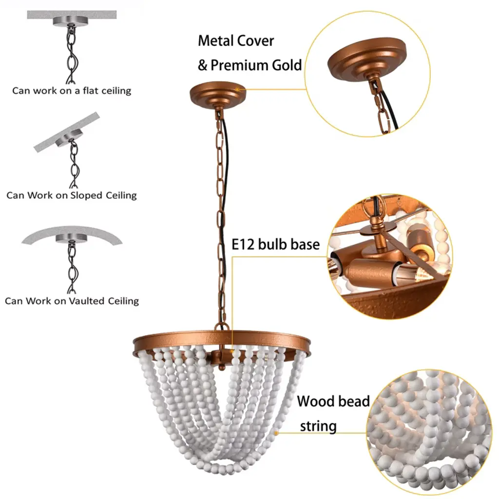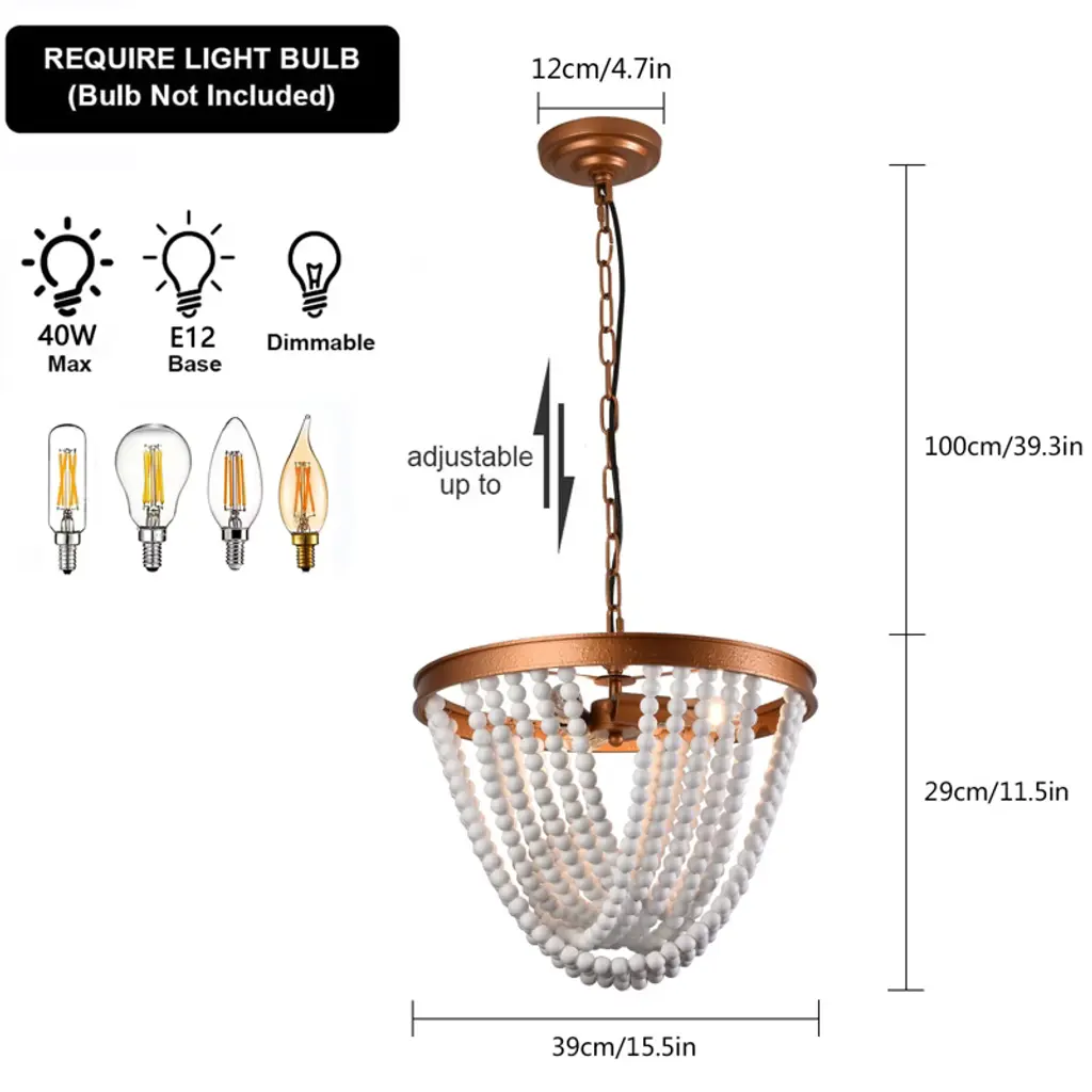 This elegantly crafted wood bead chandelier seamlessly blends rustic charm with modern sophistication. Featuring hand-strung, natural wood beads that create a warm, diffused glow, it serves as a stunning focal point for any interior. Its durable iron and wood construction, combined with an adjustable height, makes it a versatile and stylish lighting solution perfect for dining rooms, kitchens, and entryways. Specification Color: Wood&Gold Material: Iron, Wood Style: Rustic Surface Treatment: Hand Bronzing Paint Voltage: 120V/60Hz Light Source: 3*E12 Bulb (Not Included) Efficiency: E Mount Type: Ceiling Mount Maximum Power of Bulb: 40W Applicable Area: 8-12m²/86.11-129.17ft² Indoor/Outdoor Usage: Indoor Light Direction: Downlight Adjustable Height: Within 100cm/39.3inch Applicable Floor Height: Lampshade Size: 39*29cm/15.35*11.5inch Base Diameter: 12cm/4.7inch