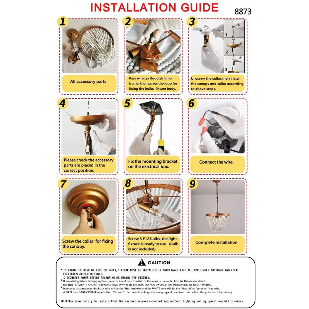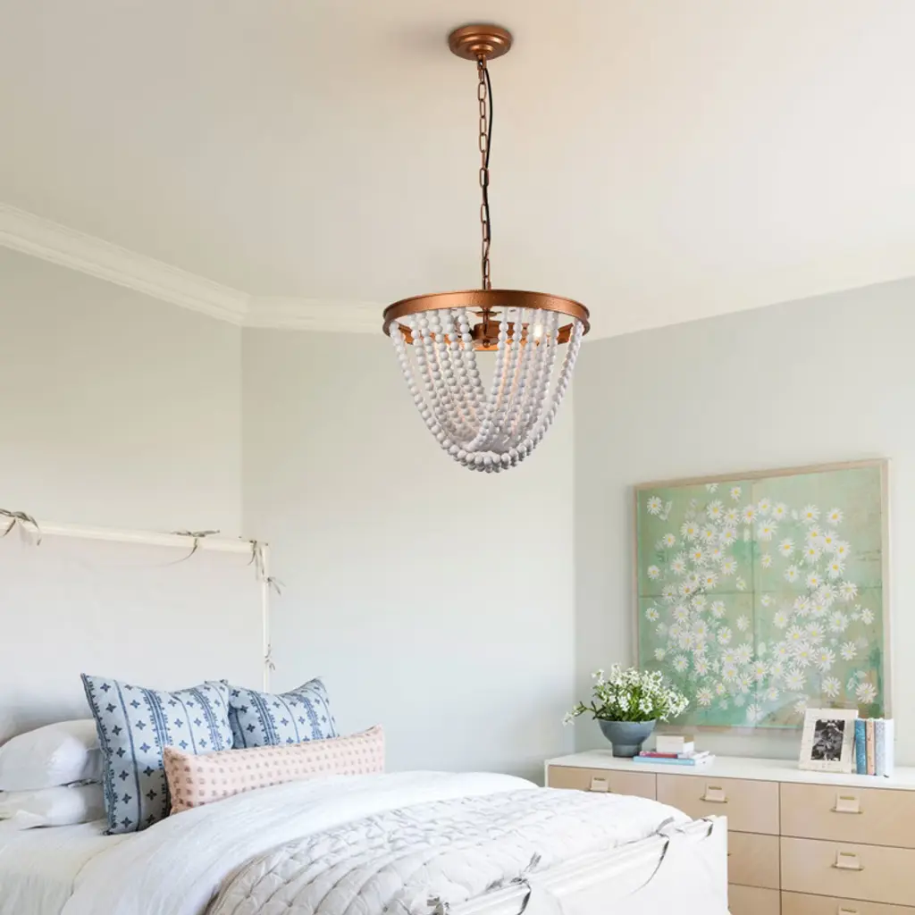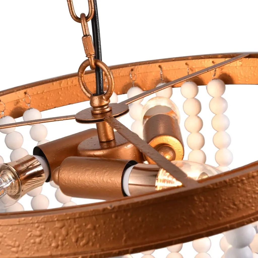 This elegantly crafted wood bead chandelier seamlessly blends rustic charm with modern sophistication. Featuring hand-strung, natural wood beads that create a warm, diffused glow, it serves as a stunning focal point for any interior. Its durable iron and wood construction, combined with an adjustable height, makes it a versatile and stylish lighting solution perfect for dining rooms, kitchens, and entryways. Specification Color: Wood&Gold Material: Iron, Wood Style: Rustic Surface Treatment: Hand Bronzing Paint Voltage: 120V/60Hz Light Source: 3*E12 Bulb (Not Included) Efficiency: E Mount Type: Ceiling Mount Maximum Power of Bulb: 40W Applicable Area: 8-12m²/86.11-129.17ft² Indoor/Outdoor Usage: Indoor Light Direction: Downlight Adjustable Height: Within 100cm/39.3inch Applicable Floor Height: Lampshade Size: 39*29cm/15.35*11.5inch Base Diameter: 12cm/4.7inch