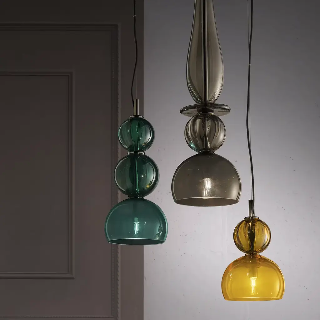 Suspended from the ceiling by means of a nickel structure with a black finish and a cable, the amber globes of this exquisite pendant will cast a sophisticated light in any room. Available in other colors and metal finishes, this simple yet elegant piece is extremely versatile and can be arranged in multicolored or monochromatic groups to accent any decor.