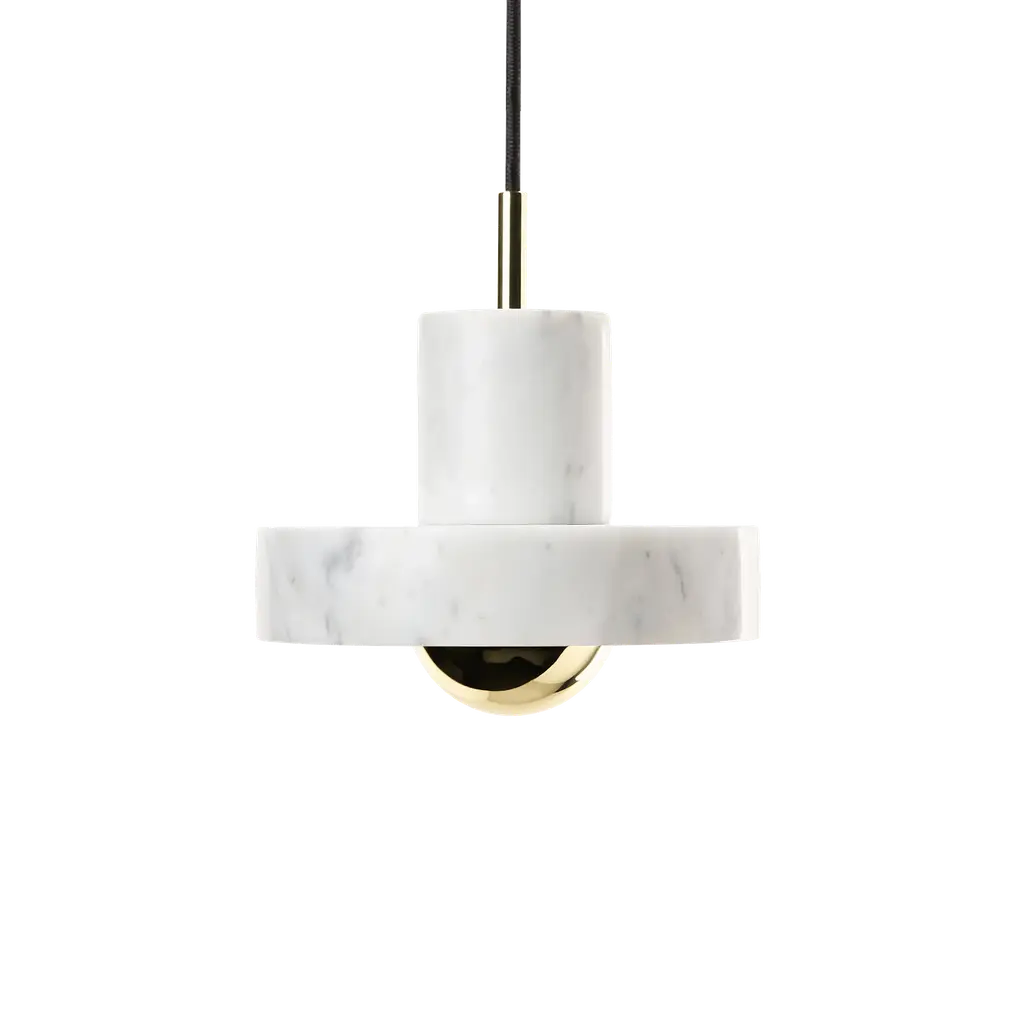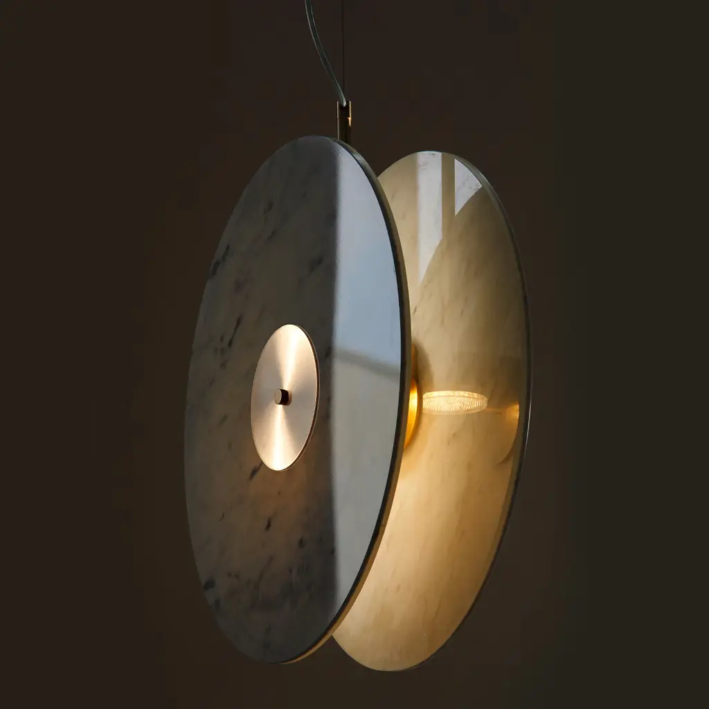 A tribute to minimalist design and to the marvelous natural allure of marble, this pendant lamp draws inspiration from the shape of the namesake toy. It features a round shade comprised of two white marble disks, enriched with gold-finished metal details that enhance its sophisticated allure. Please ask the Concierge for technical specifications.