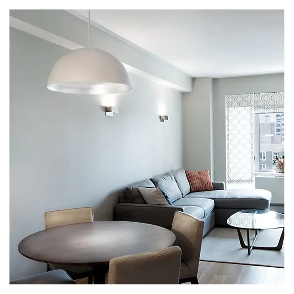 The Yolo Pendant Light by Modern Forms is a clean, artisan-inspired piece fit for contemporary settings. Its design features a large spun-metal dome with contrasting inner and outer finishes that have been hand-applied for quality, consistency, and an appealing handmade aesthetic that breathes life back into your living space. Lighting is provided by an internal LED source, whose warm radiance funnels down over a surface or area of interest.