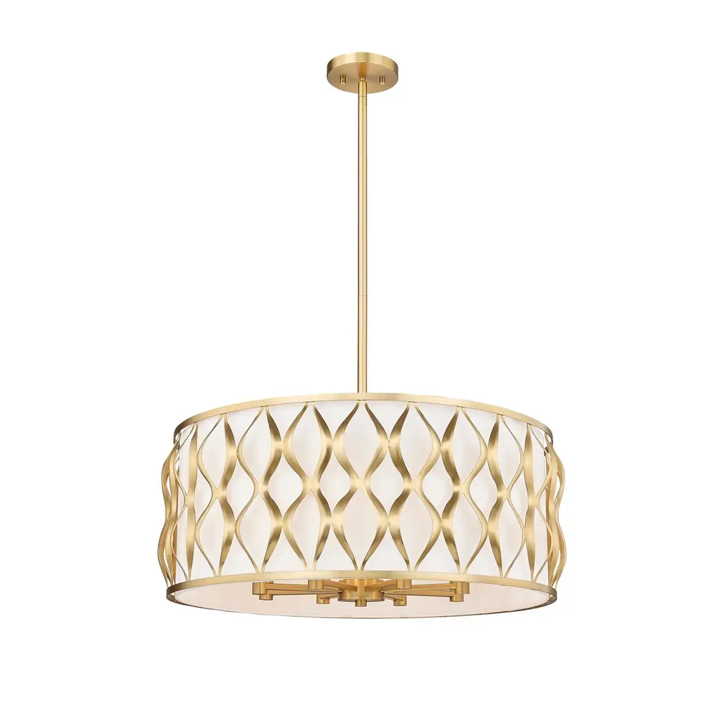A soft fabric drum shade nestled within a sculptural metal frame creates a transitional look that will never go out of style. The Harden family offers casual elegance for every room in the home — from wall sconces to flush-mounts and two sizes of pendant drum fixtures.Features:Dimensions:Electrical Specifications: