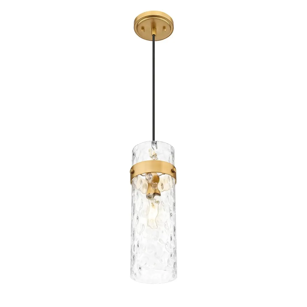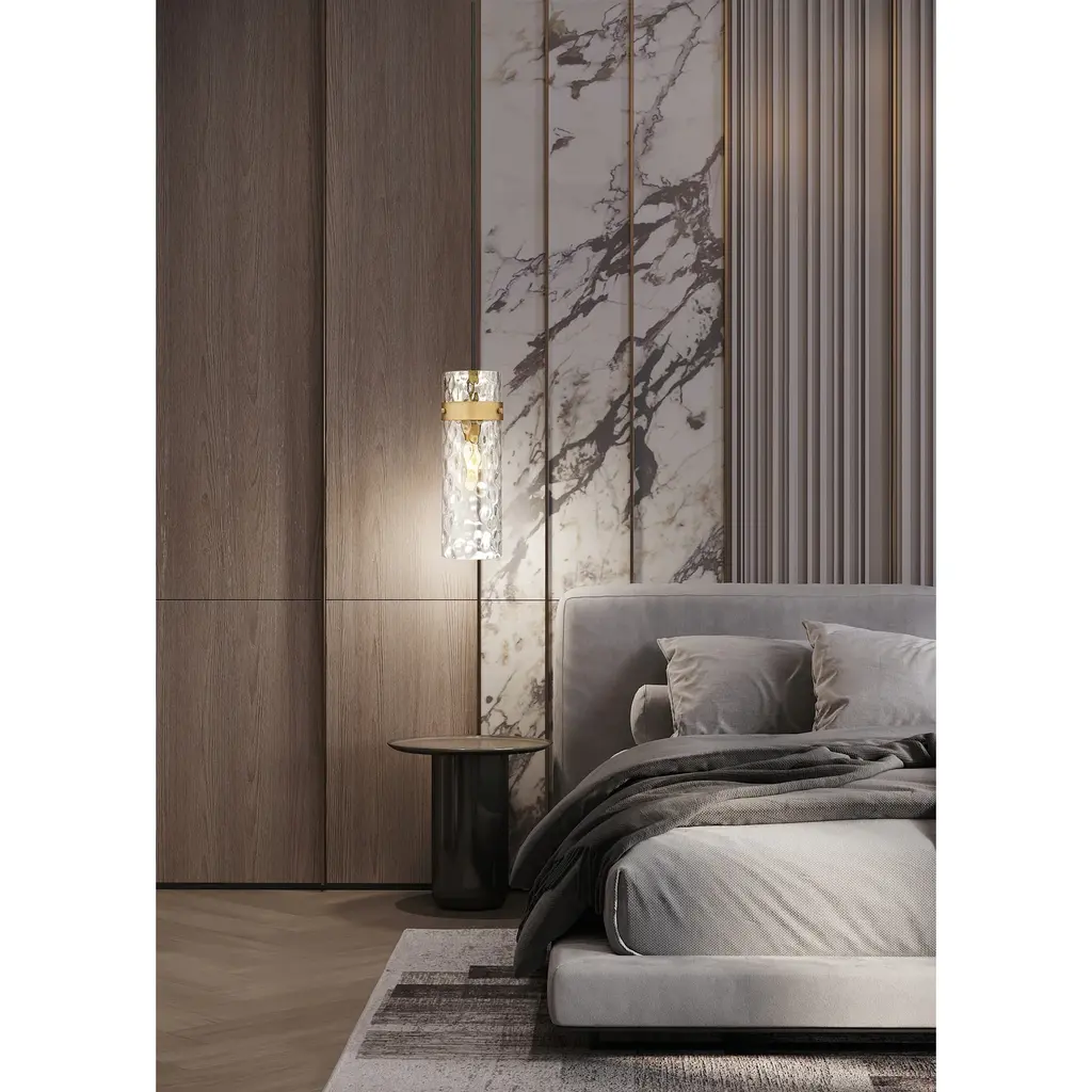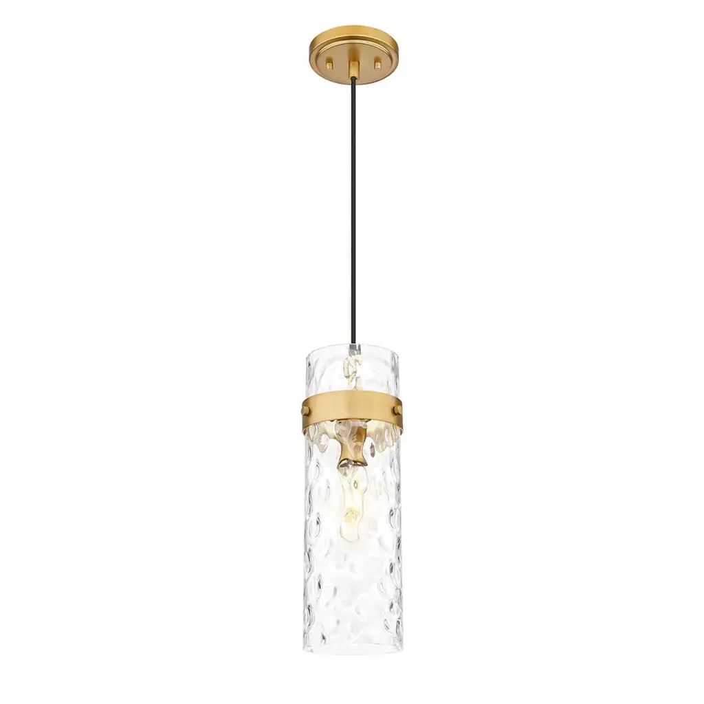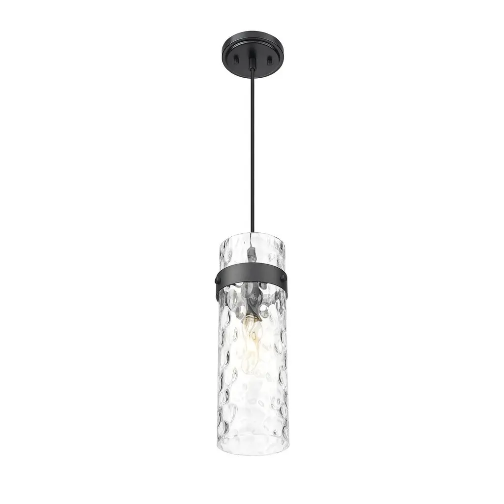 Set a sophisticated tone alone or in series with this modern one-light pendant. It pairs a canopy and collar with a braided cord, creating the perfect blend of texture and depth. Its water glass shade ripples enticingly, delivering impressive dimension and sophistication.Features:Dimensions:Electrical Specifications: