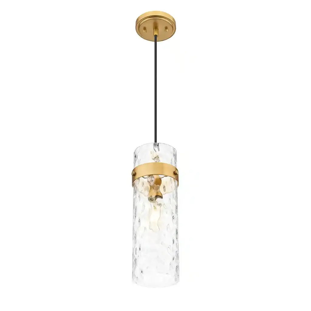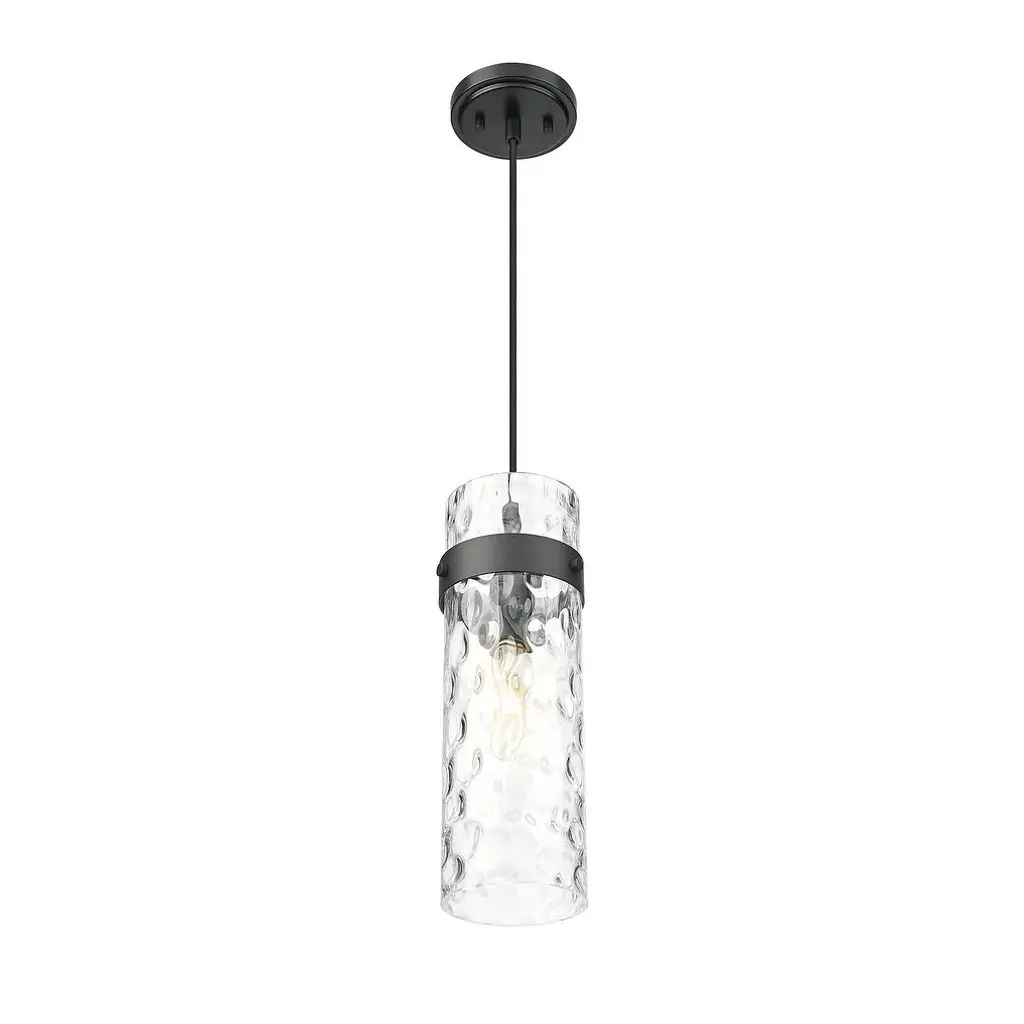 Set a sophisticated tone alone or in series with this modern one-light pendant. It pairs a canopy and collar with a braided cord, creating the perfect blend of texture and depth. Its water glass shade ripples enticingly, delivering impressive dimension and sophistication.Features:Dimensions:Electrical Specifications:
