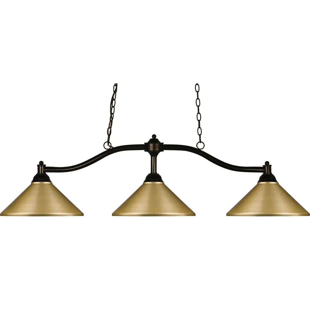 Simple yet versatile detailing defines this beautiful three light fixture. Finished in bronze and paired with satin gold metal shades, this three light fixture would be equally at home in the game room, or anywhere else in the house needing a touch of timeless charm.72 inches of chain per side is included to ensure the perfect hanging height. Game Room/Dining Room/Kitchen/Kitchenette Shade Included: Yes Cord Length: 110.00 Dimmable: Yes
