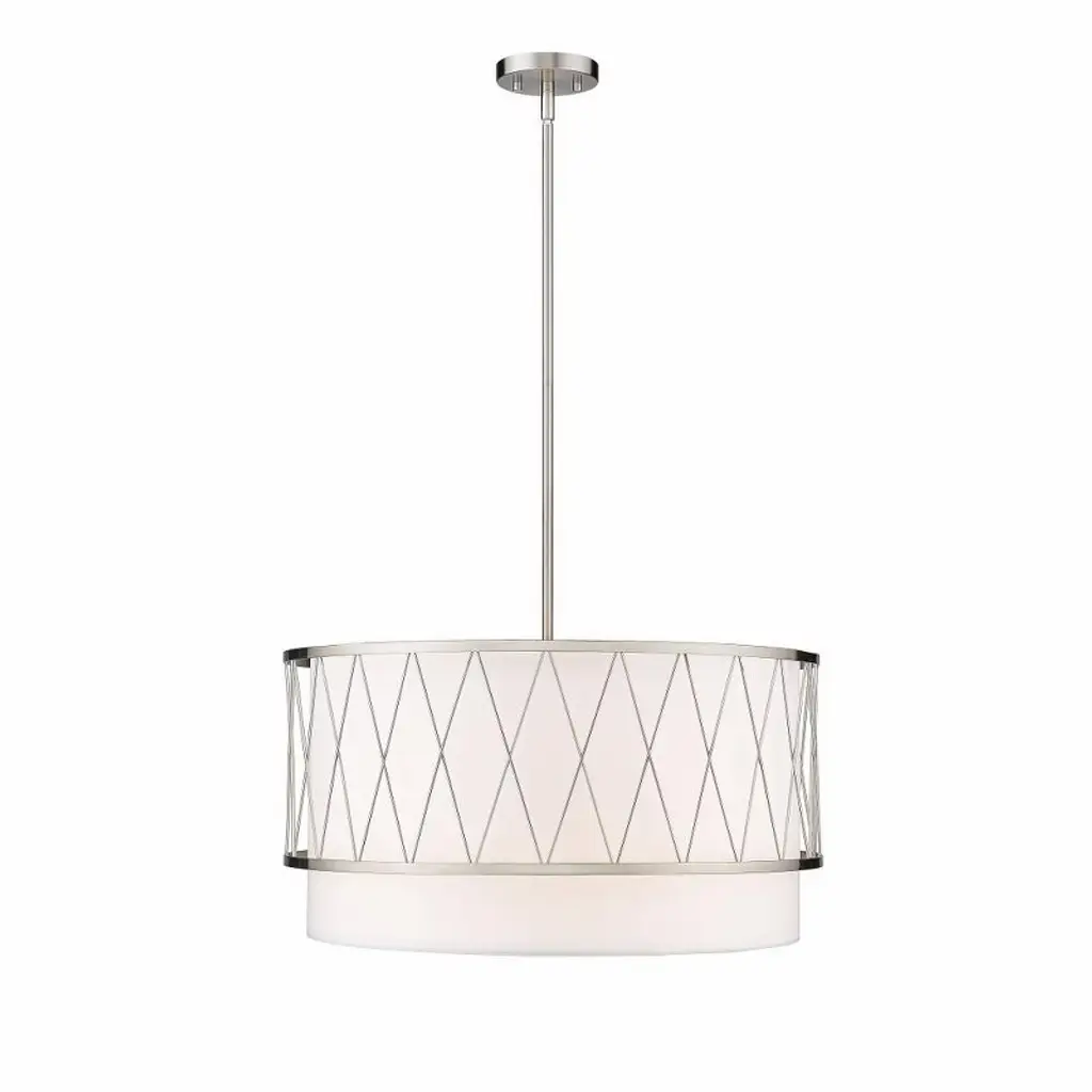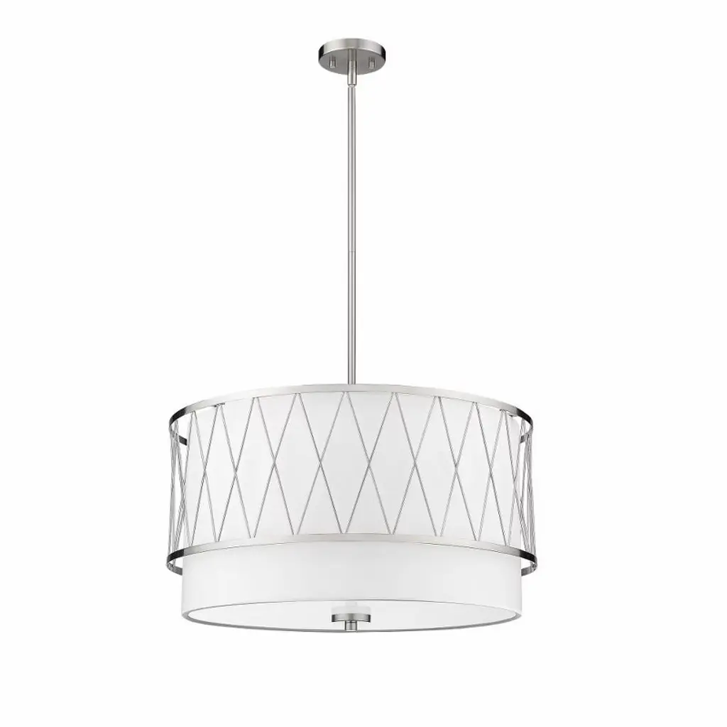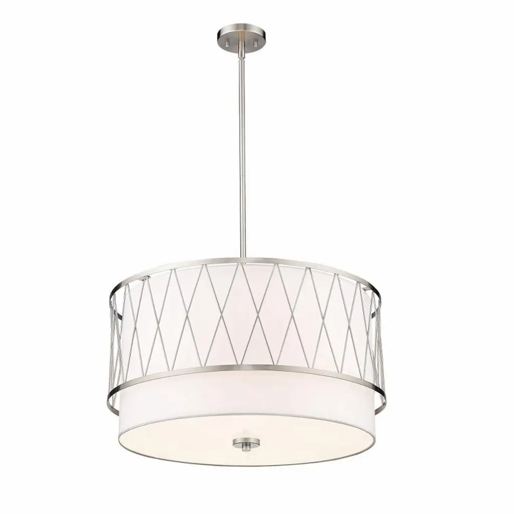 Designed in a lustrous brushed nickel finish cage made up of slim rods in a diamond-like pattern, this modern four-light pendant lends a vintage-inspired Mid-Century Modern aesthetic. A white fabric drum shade peeks out beneath the cage to create a tiered multi-level design that adds depth and dimension to spaces like kitchens and entryway foyers, offering a shimmering glamorous metallic element to the interior.
