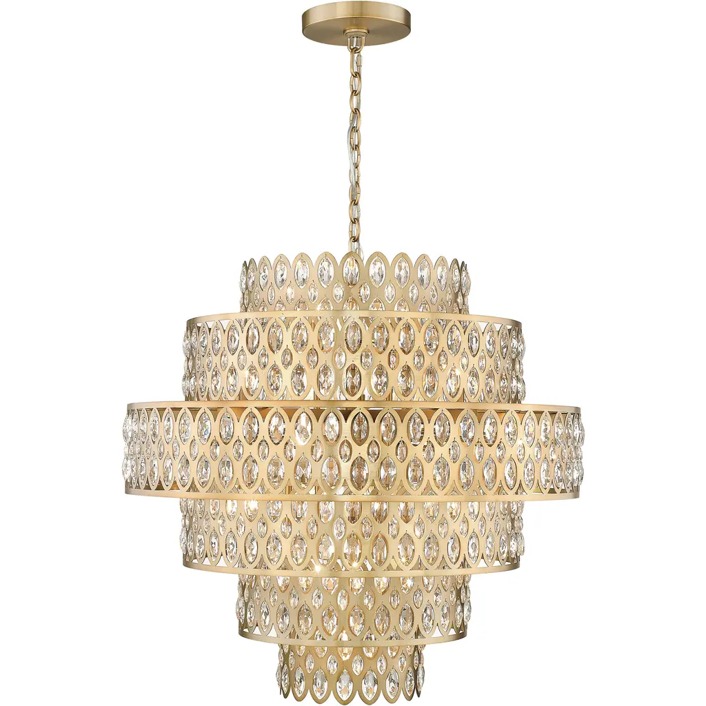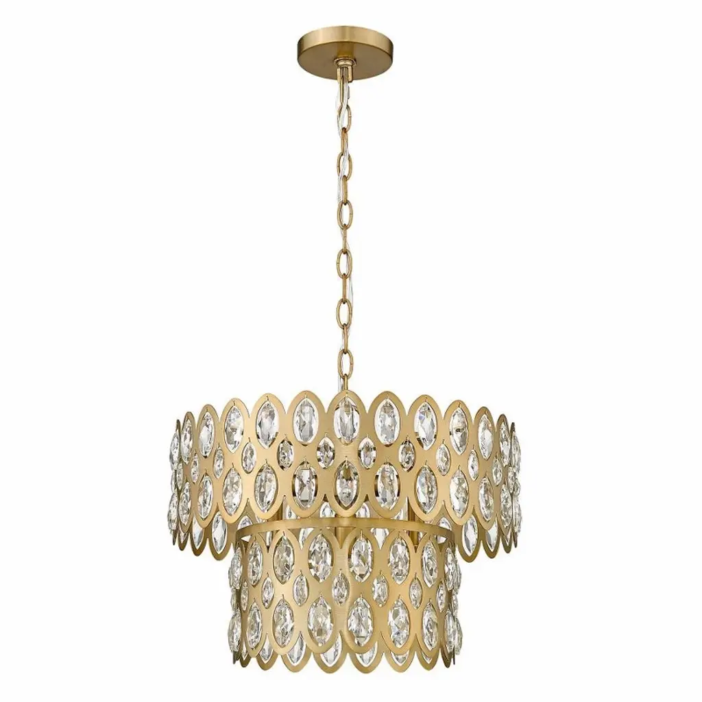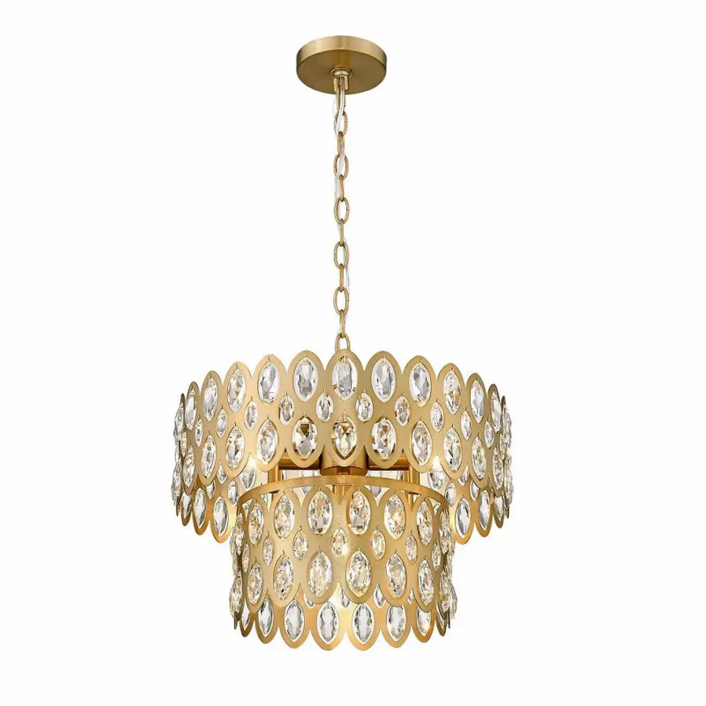 Oval cut-outs are filled with glittering crystals that bring sparkling personality to two tiers in this modern glam five-light pendant. Glowing in warmth, the fixture shows off an heirloom brass finish over steel construction, with a layered look and feel . From the Dealey collection, this glamorous pendant is a perfect fit over a compact kitchen or entryway.