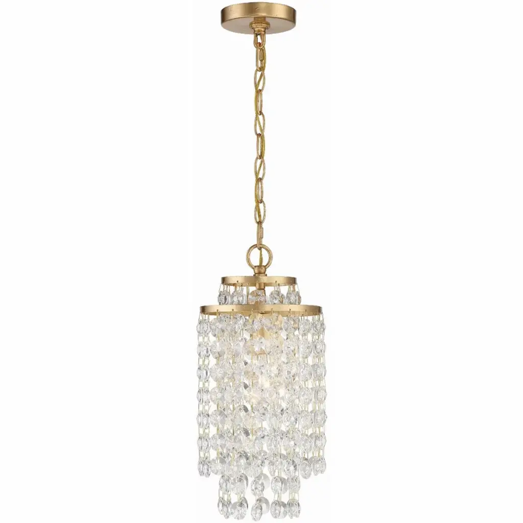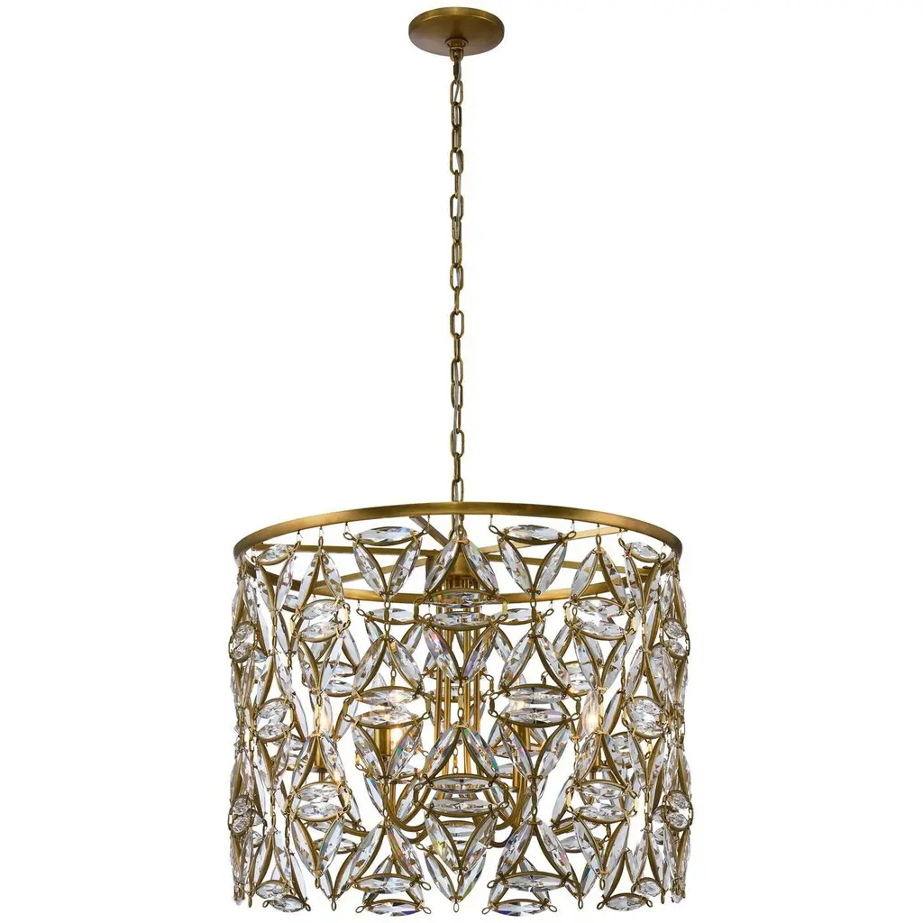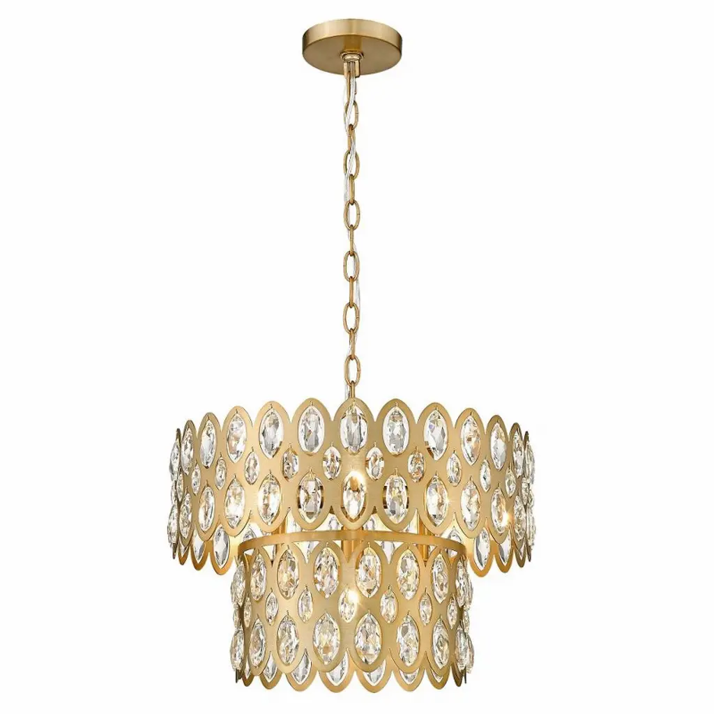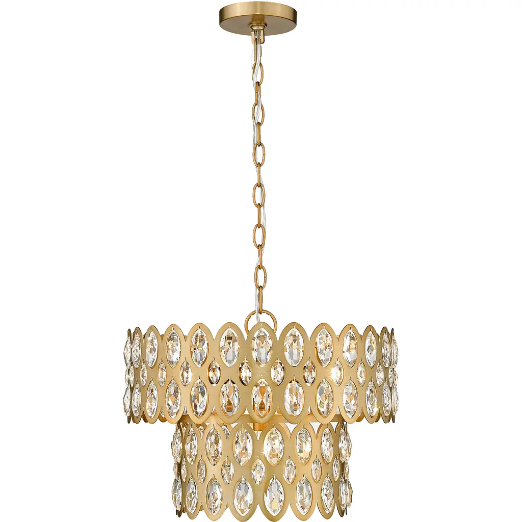 Oval cut-outs are filled with glittering crystals that bring sparkling personality to two tiers in this modern glam five-light pendant. Glowing in warmth, the fixture shows off an heirloom brass finish over steel construction, with a layered look and feel . From the Dealey collection, this glamorous pendant is a perfect fit over a compact kitchen or entryway.