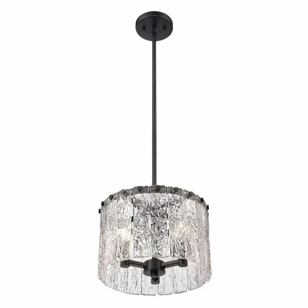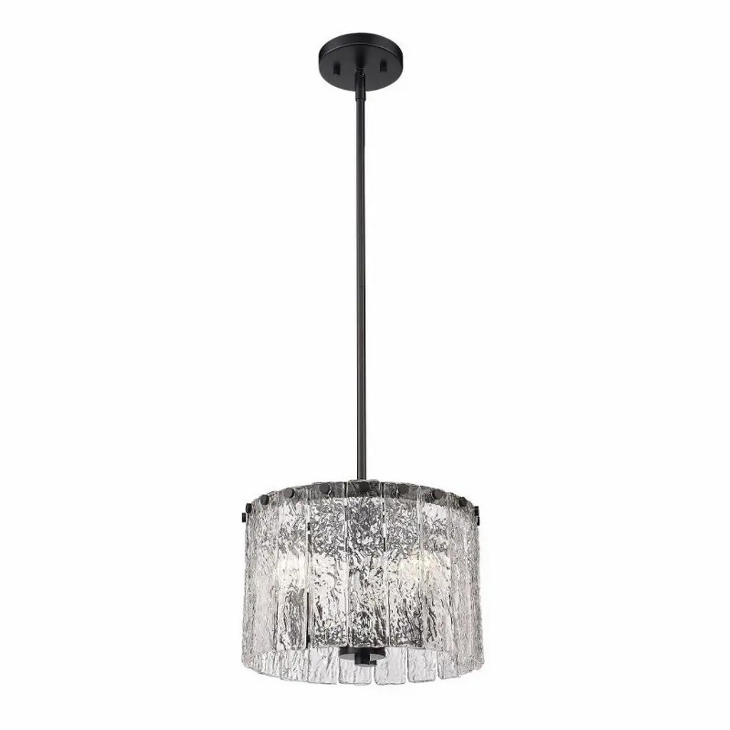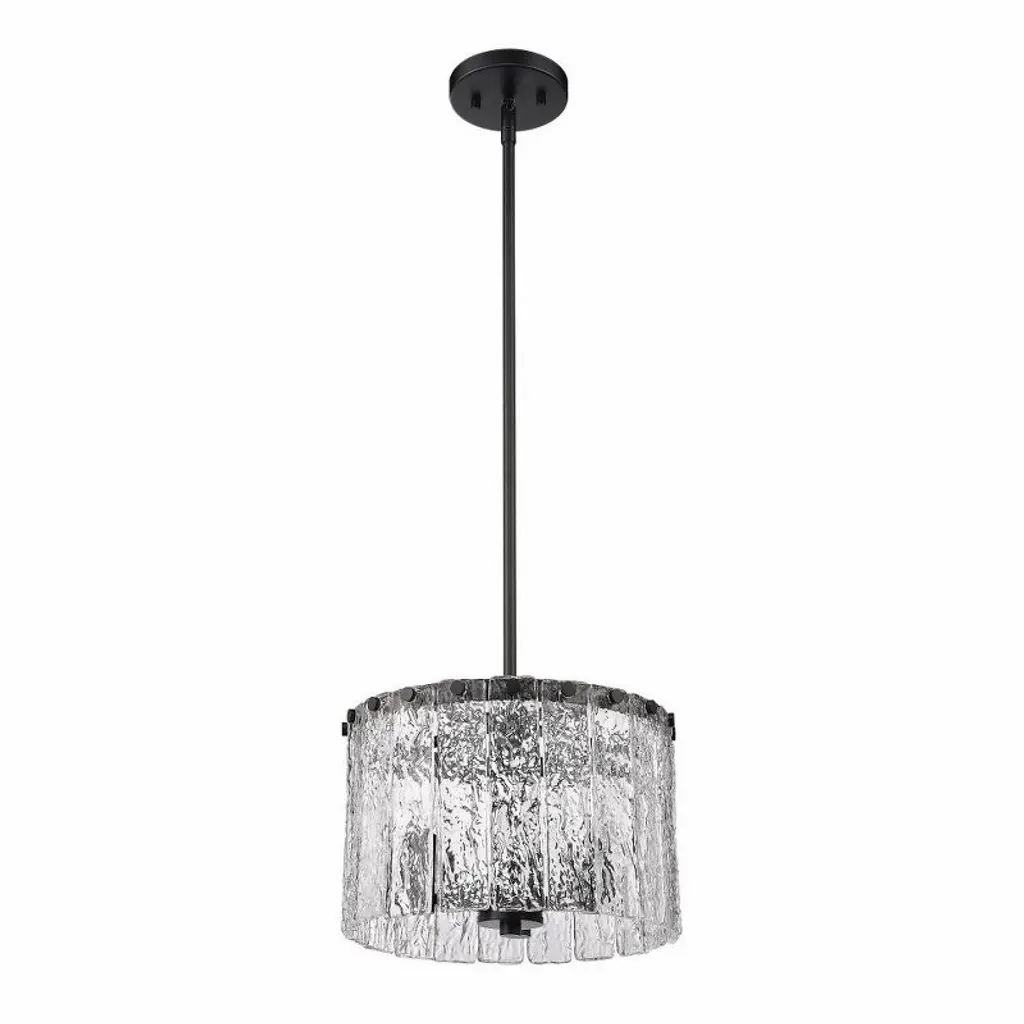 Embellish a custom living space with the industrial version of modern glam, choosing this striking fixture as a reference point and source of glowing illumination. The Glacier three-light pendant delivers a lush aesthetic with individual clear textured glass panels that emulate melting ice, a chic design with dramatic impact. Bold matte black finish steel is placed as a crown fraB208:B217me, providing tantalizing contrast and enhancing the gallery feel of a foyer or main living space with both natural and industrial inspiration.