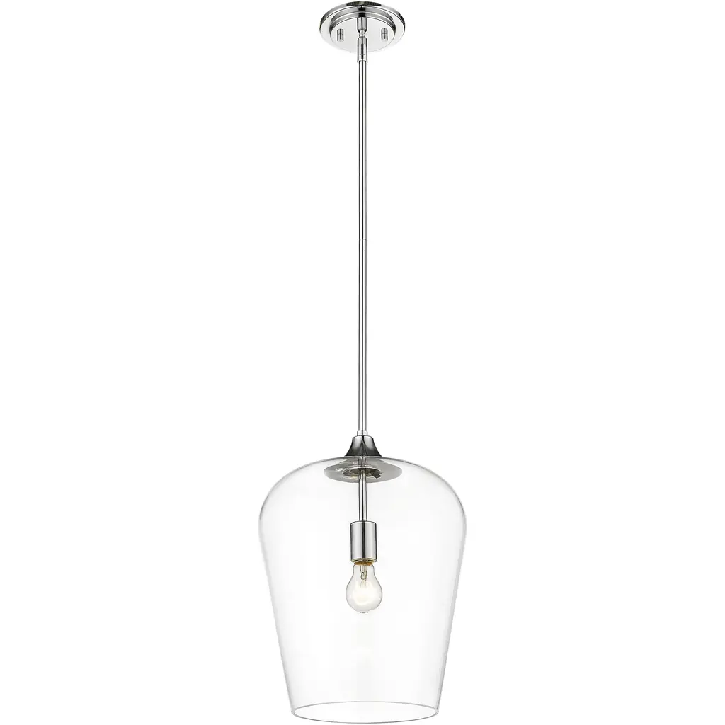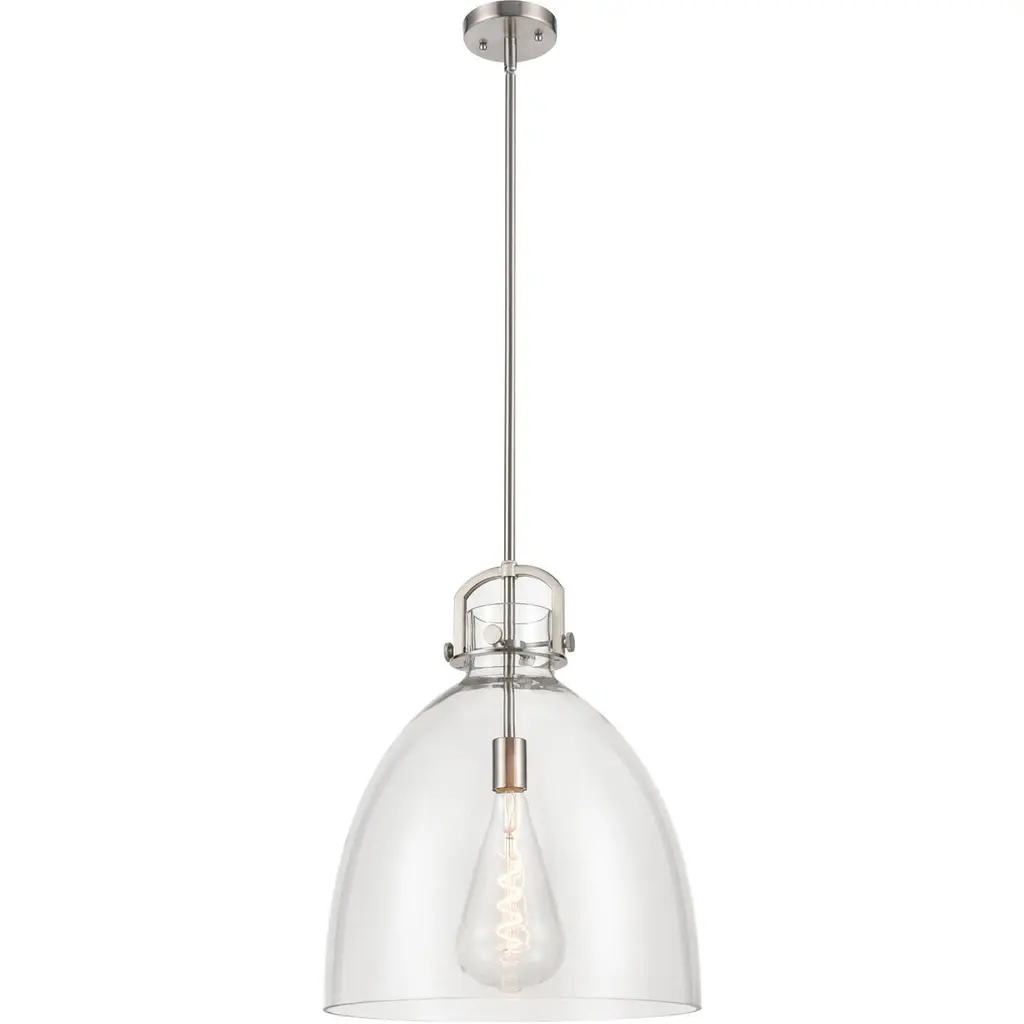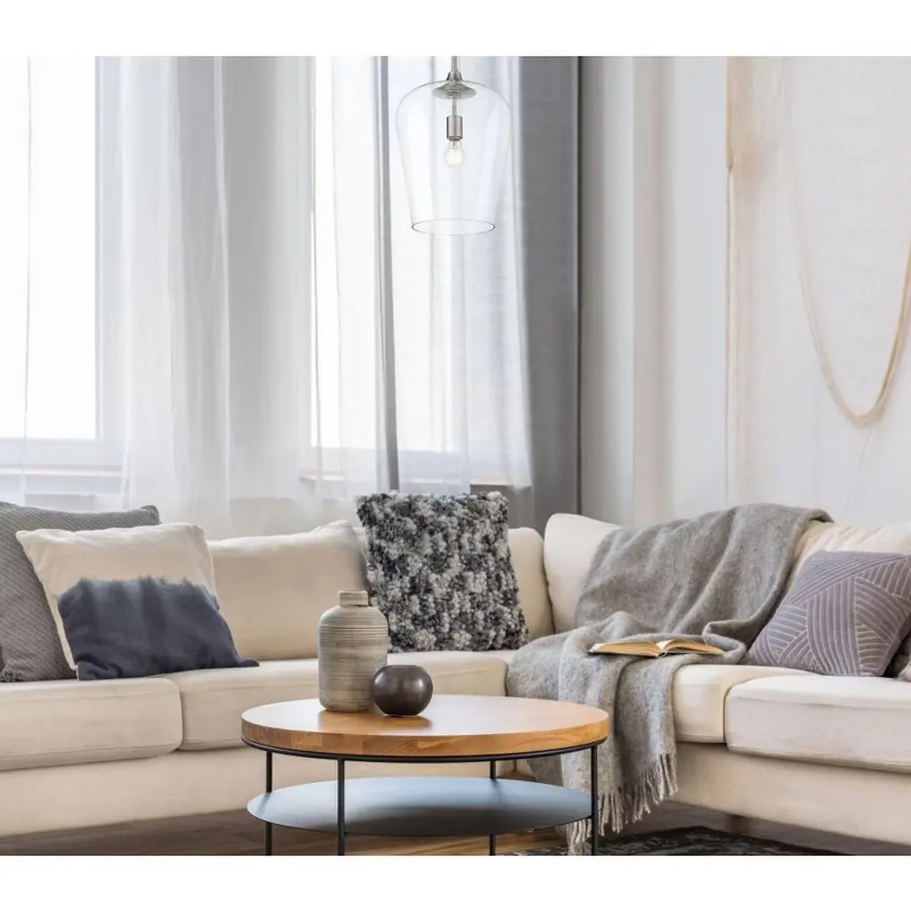 Designed with sleek metal lines and an elegant silhouette, this brushed nickel pendant is a stunning home decor upgrade. This single-light fixture features a clear glass shade for a magnificent display of light. Material: Glass, Finish Color: Brushed Nickel, Width: 12", Height: 16.25", Lamping Type: Incandescent, Number Of Bulbs: 1, Wattage: 100 Watts, Dimmable: Yes, Moisture Rating: Dry Rated
