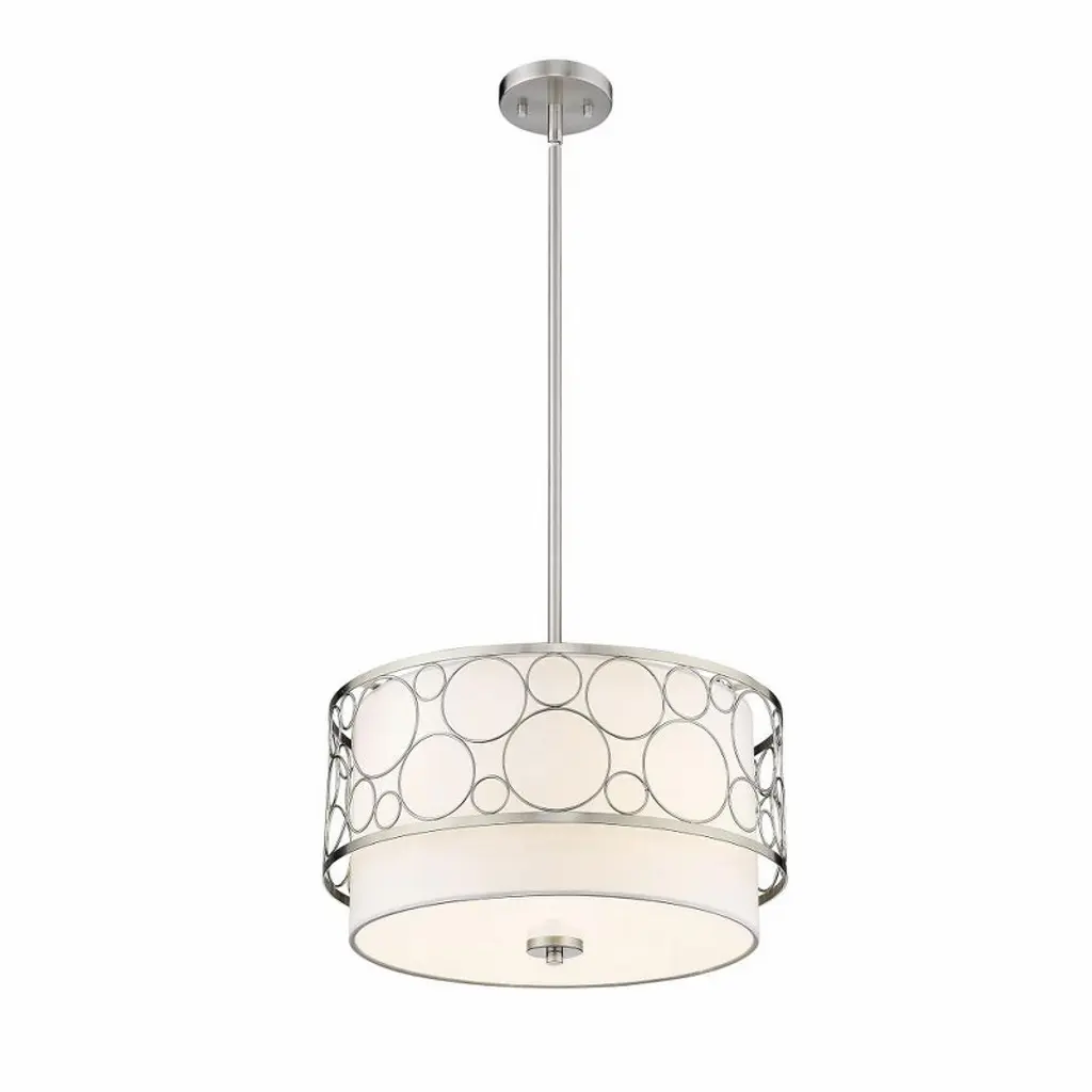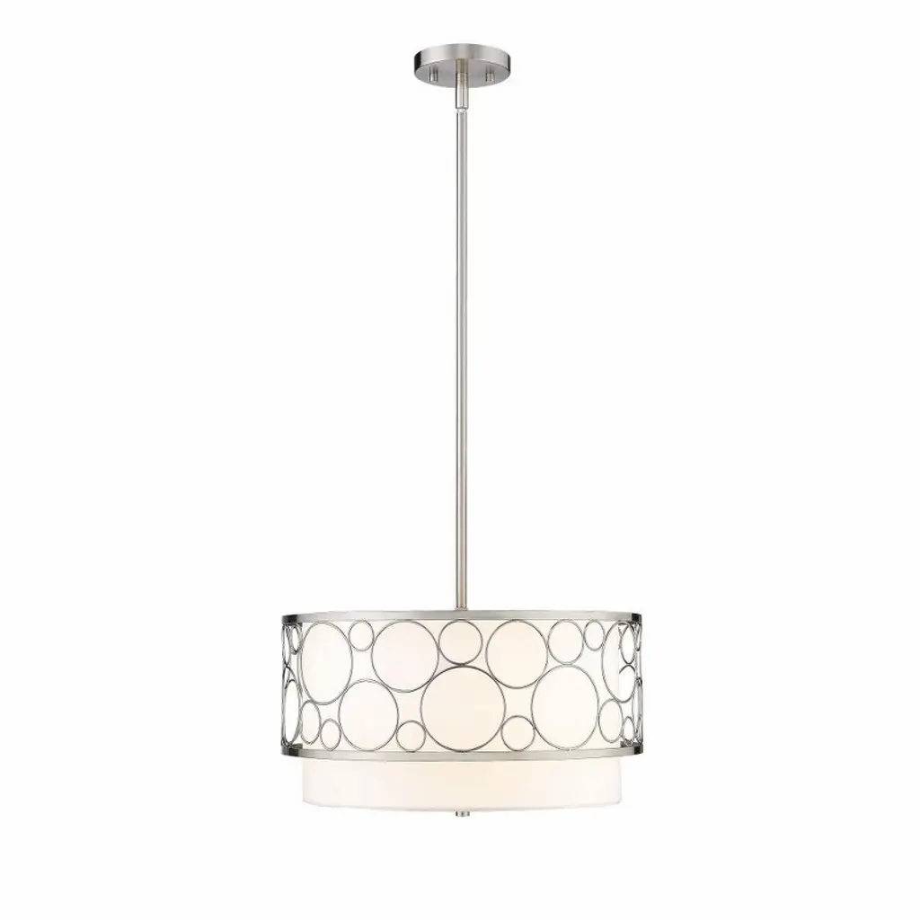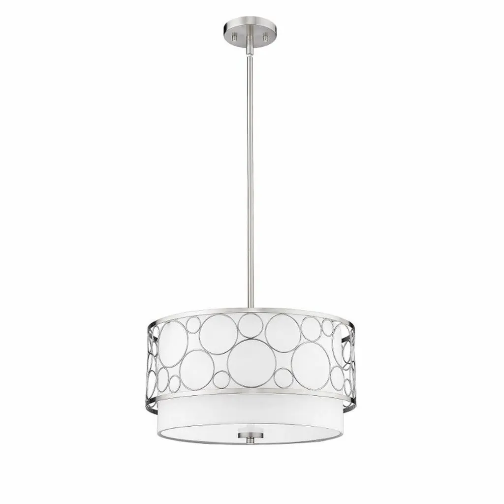 Create a breathtaking contemporary aesthetic within a space with this transitional three-light pendant. A soothing glow emitted from inside a beautiful white linen drum shade as a brushed nickel finish cage offers a champagne bubble-inspired, geometric motif that catches the eye.
