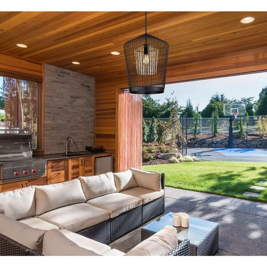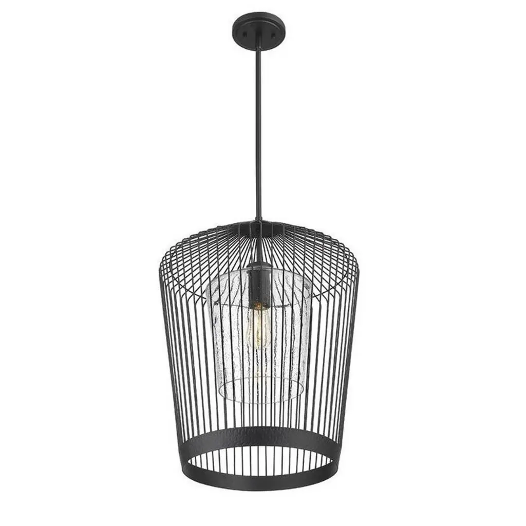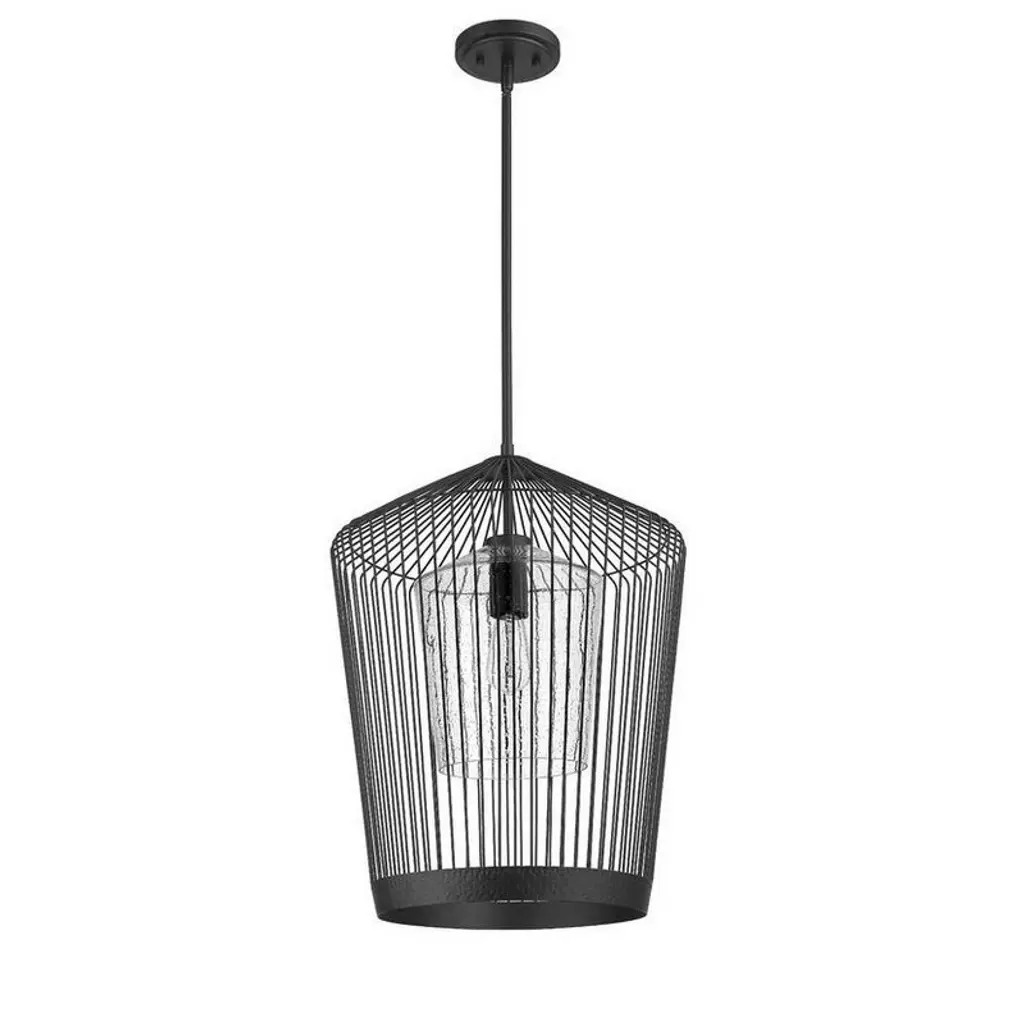 A transitional take on a vintage feel, this damp location-listed indoor/outdoor pendant complements a variety of designs from Mid-Century Modern to Coastal Chic. The beautiful, artisan-formed metal frame is paired with a lightly seeded glass diffuser and accented by a bottom belting of hammered metal. The Black finish enhances the craftsmanship. Room Recommendation: Bedroom/Dining Room/Dinette/Foyer/Hallway/Kids Room/Kitchen/Kitchenette/Living Room/Office Rod Length(s): 1-3, 1-6, 6-12 Dimmable: Yes Shade Included: Yes