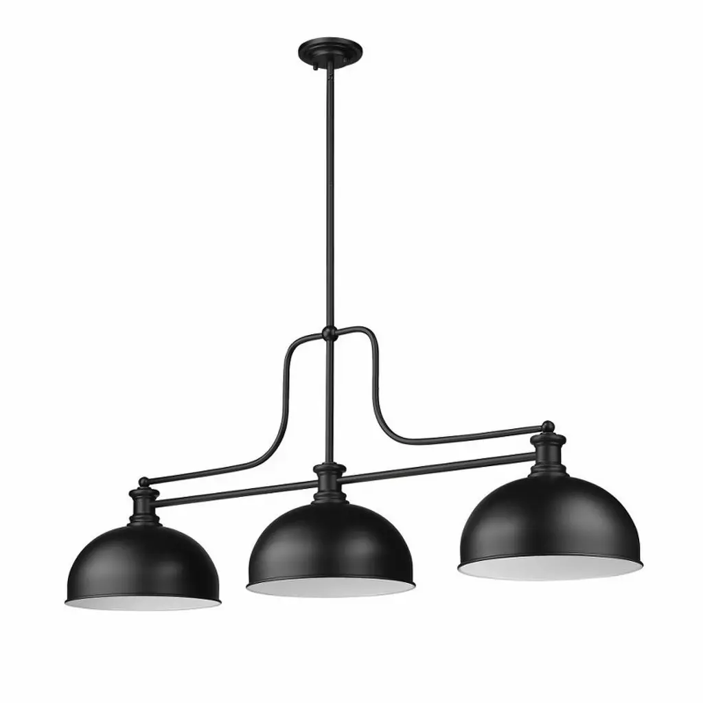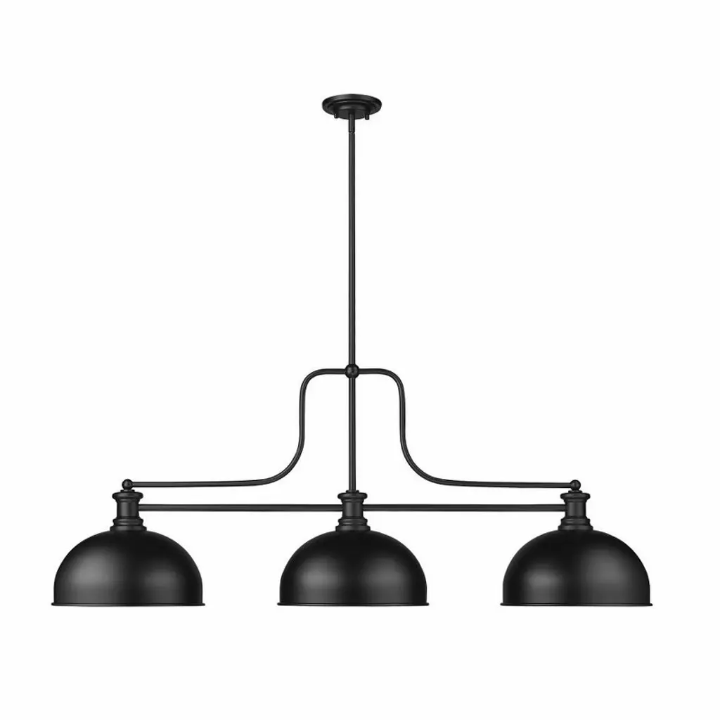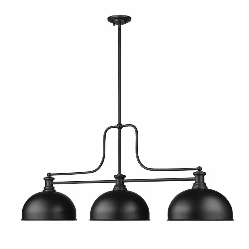 A subtle industrial vibe and monochromatic matte black finish flatter this three-light billiards pendant from the Mélange collection by Z-Lite. A simple yet fluid silhouette blends matte black steel framing and matching dome-shaped steel shades, forming a perfectly balanced profile. This charming fixture is an ideal solution to brighten a kitchen island or sports room billiard space.