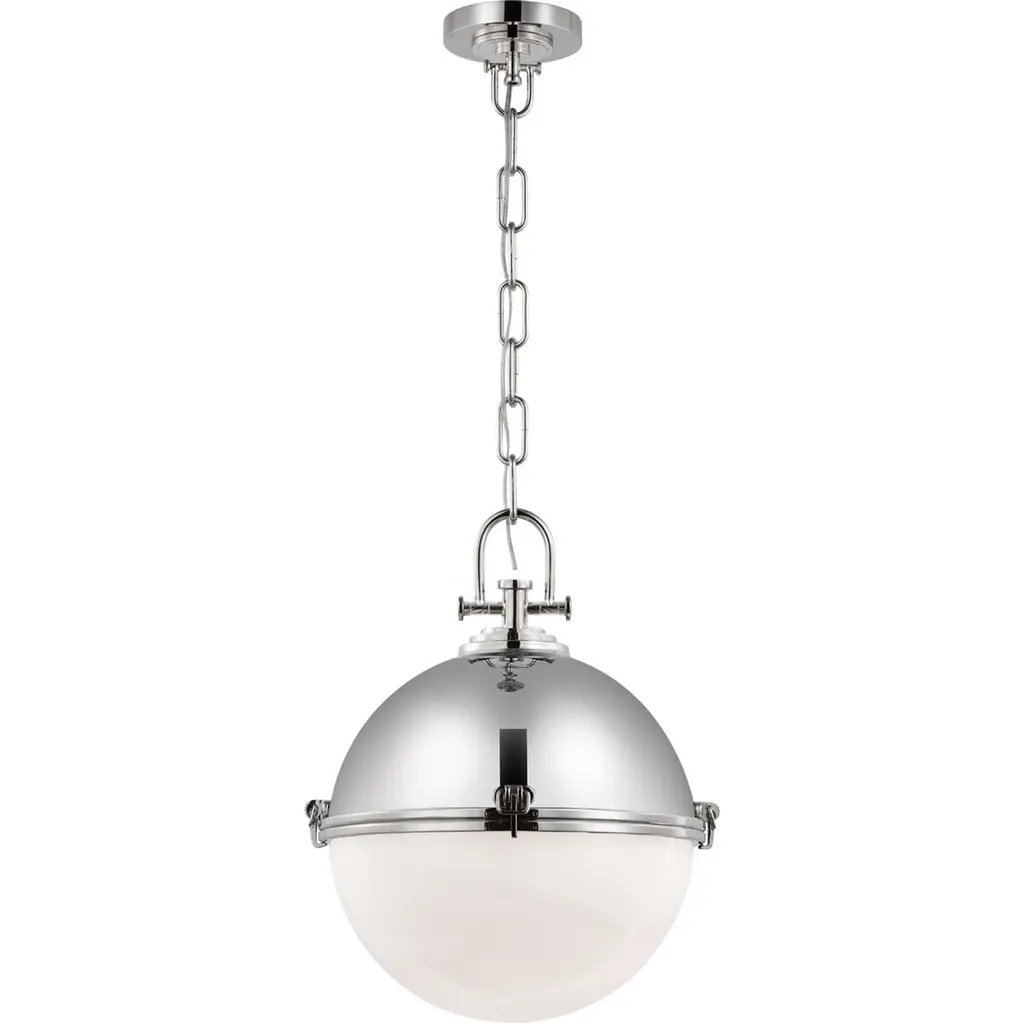 Retro influences present a timeless aesthetic to this restoration style two-light pendant, designed with an elegant grandly sized globe shape lantern. The large moon shape lantern offers extra dimension with its mesmerizing iron dome cover detailed with petite decorative rivets along the band that create a vintage-inspired industrial feel. The gleaming classic brass finish offers a glam metallic touch to this charming traditional pendant, contrasted by a softly diffused illumination that shines from the rounded opal glass bottom shade.