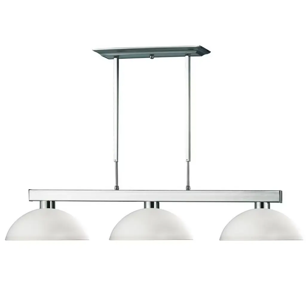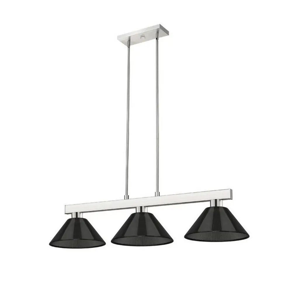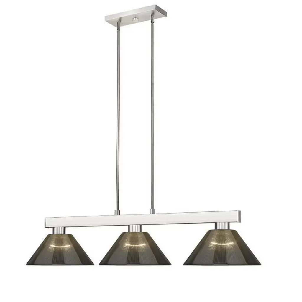 Straight line inspired detailing defines this beautiful three light fixture. Finished in brushed nickel and paired with metal brushed nickel shades, this three light fixture would be equally at home in the game room, or anywhere else in the house needing a touch of modern charm. Adjustable rods are included to ensure the perfect hanging height. Game Room/Dining Room/Kitchen/Kitchenette No. of Rods: 10 Shade Included: Yes Rod Length(s): 12.00 Dimmable: Yes