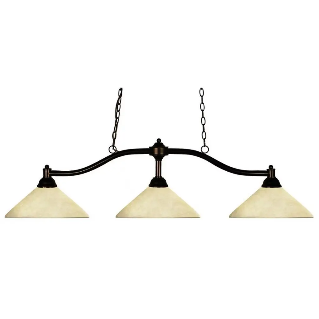 Elegant and traditional best describes this beautiful three light fixture. Finished in oil rubbed bronze and paired with golden mottle shades, this three light fixture would be equally at home in the game room, or anywhere else in the house needing a touch of timeless charm. 72 inches of chain per side is included to ensure a perfect hanging height. Game Room/Dining Room/Kitchen/Kitchenette Shade Included: Yes Cord Length: 110.00 Dimmable: Yes