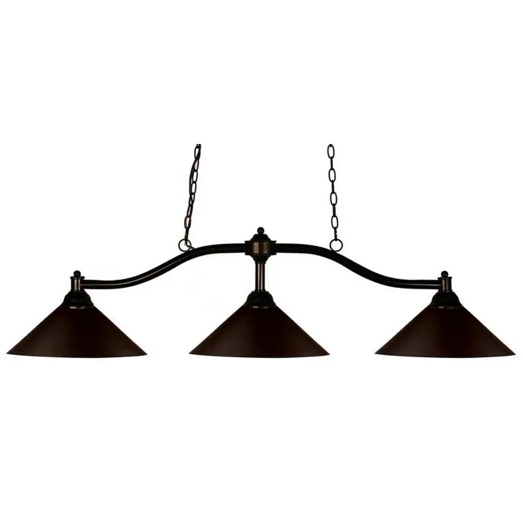 Elegant and traditional best describes this beautiful three light fixture. Finished in oil rubbed bronze and paired with metal bronze shades, this three light fixture would be equally at home in the game room, or anywhere else in the house needing a touch of timeless charm. 72 inches of chain per side is included to ensure a perfect hanging height. Game Room/Dining Room/Kitchen/Kitchenette Shade Included: Yes Cord Length: 110.00 Dimmable: Yes