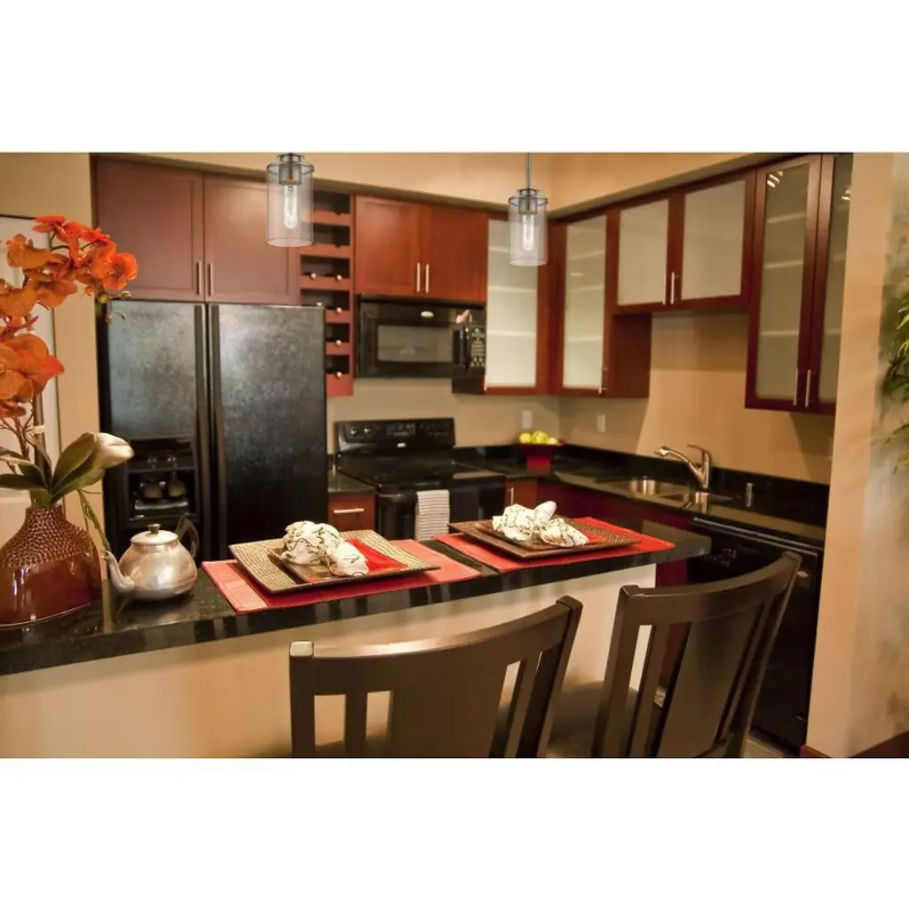 Avant-garde touches give this mid-century modern one-light mini pendant an elegant chicness. Highlighting the glowing brilliance of the clear glass cylinder shade, the brushed nickel finish complements with a perfect gleaming tone. Bedroom/Dining Room/Dinette/Kitchen/Kitchenette No. of Rods: 7 Shade Included: Yes Cord Length: 110.00 Rod Length(s): 12.00 Dimmable: Yes Material: Steel, Finish Color: Brushed Nickel, Width: 4.5", Height: 8", Lamping Type: Incandescent, Number Of Bulbs: 1, Wattage: 100 Watts, Dimmable: Yes, Moisture Rating: Dry Rated