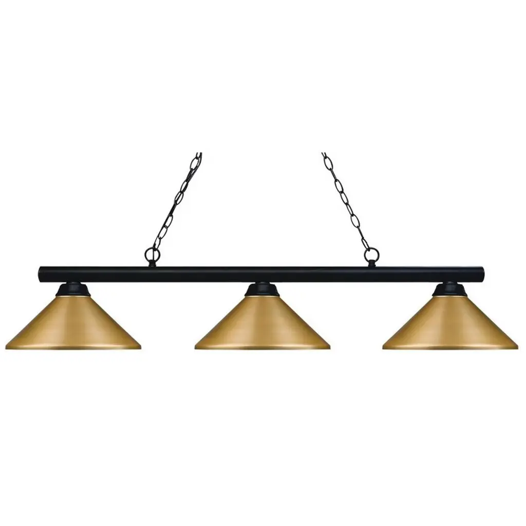 Classic and simple detailing defines this beautiful three light fixture. Finished in bronze and paired with satin gold metal shades, this three light fixture would be at home in the game room. 72 inches of chain per side are included to ensure the perfect hanging height. Game Room/Dining Room/Kitchen/Kitchenette Shade Included: Yes Cord Length: 60.00 Dimmable: Yes