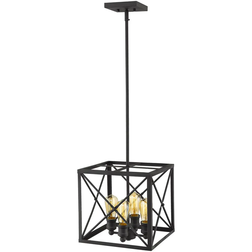 Slim steel outlines this contemporary four-light pendant, creating an eye-catching tesseract-like geometric design that modernizes transitional interior spaces like foyers and kitchen islands. Across the sharply angled steel silhouette is a dramatic matte black finish, enhancing the modern architectural feel and aesthetic. Resting within the open and airy pendant is a candelabra style fixture with four arms holding exposed bulbs for a minimalist industrial effect.
