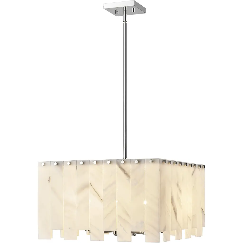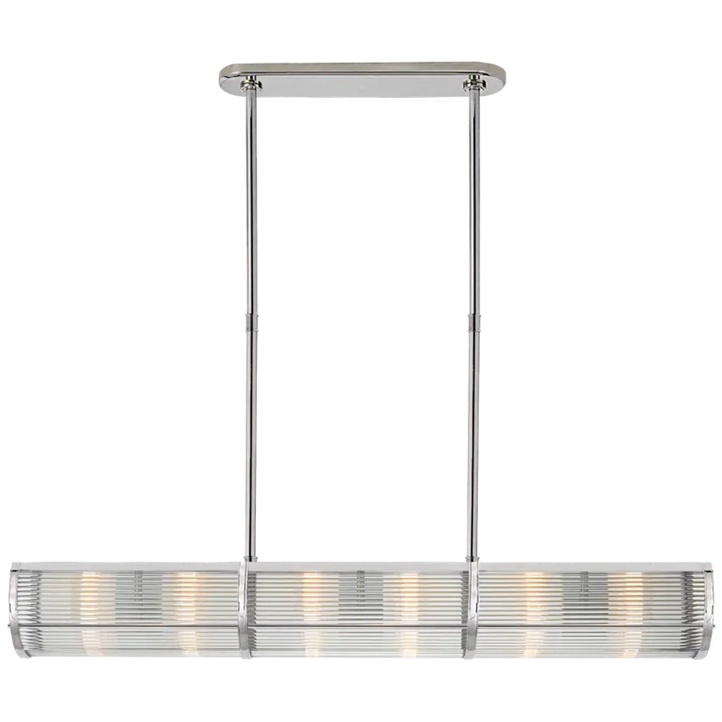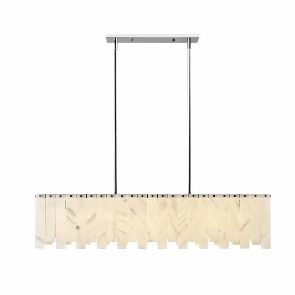 Indulgent Art Deco style maintains a tasteful aesthetic in a light fixture that delivers on versatility and style. Featuring tasteful alabaster-like strips alternating in length and arranged around a rectangular steel frame, this seven-light island light delivers a versatile yet decadent look. Charming polished nickel finish rivot detailing elevates this gallery inspired island light that goes with the flow as it complements a gritty rendition of toned-down glam in a modern kitchen or entertaining setting.