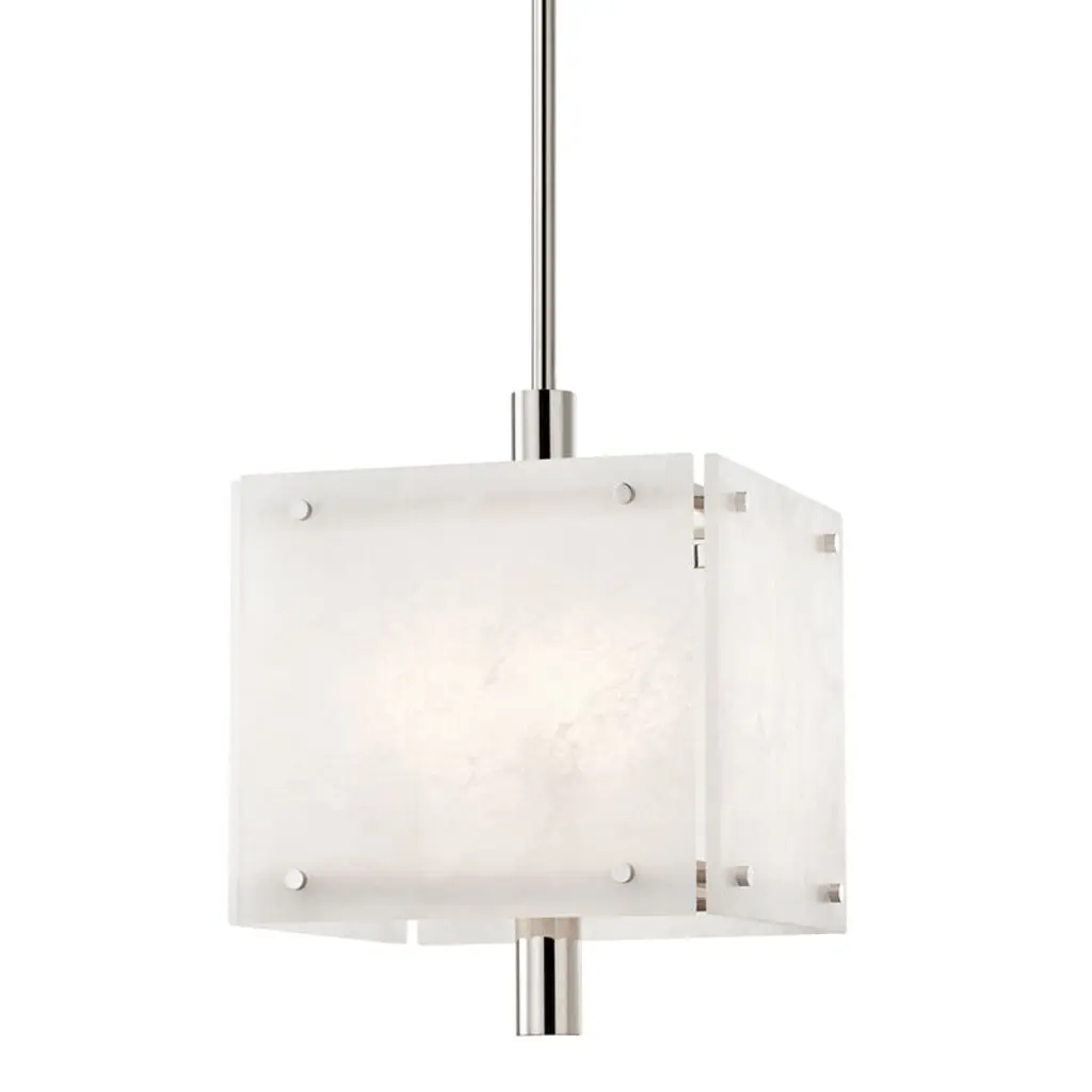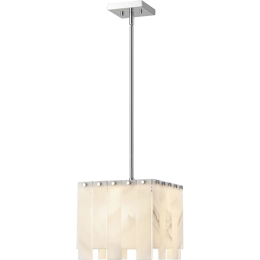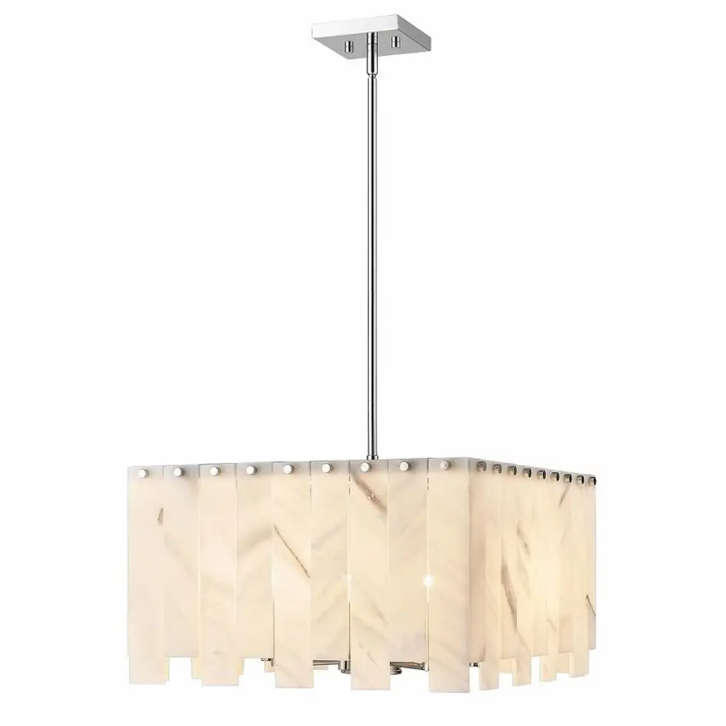 Indulgent Art Deco style maintains a tasteful aesthetic in a light fixture that delivers on versatility and style. Featuring tasteful alabaster-like strips alternating in length and arranged around a rectangular steel frame, this seven-light island light delivers a versatile yet decadent look. Charming polished nickel finish rivot detailing elevates this gallery inspired island light that goes with the flow as it complements a gritty rendition of toned-down glam in a modern kitchen or entertaining setting.