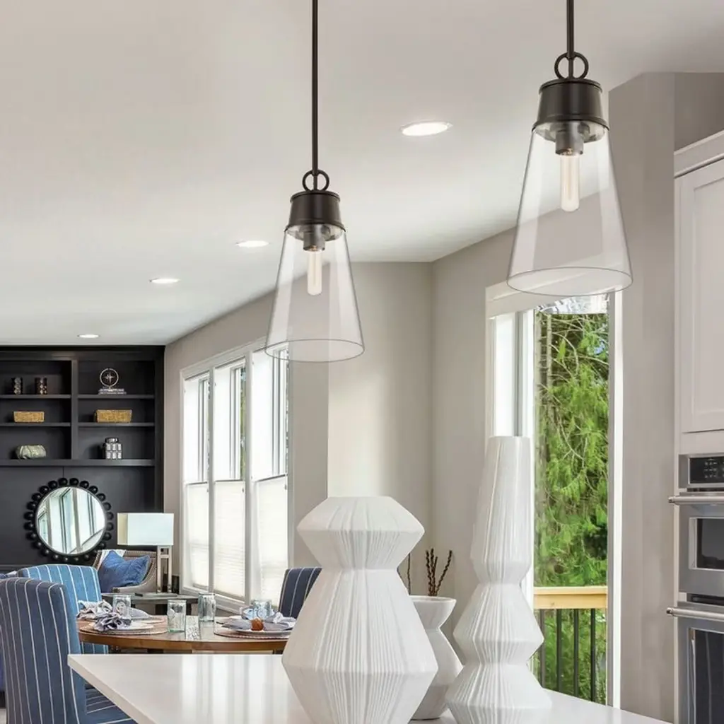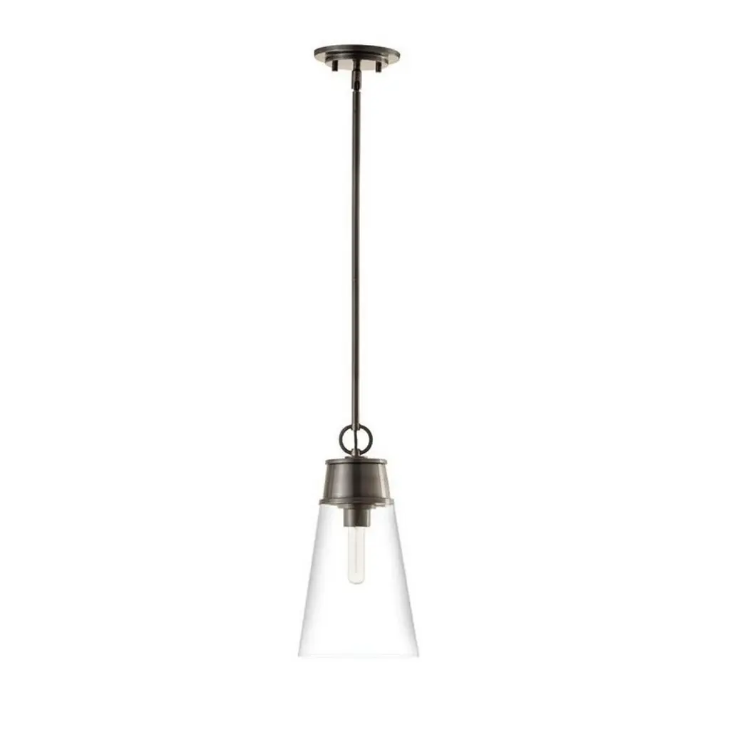 A slender silhouette forms enticingly clean lines that enhance the sophisticated look of the Wentworth single-light mini pendant. Bring targeted lighting to a nook or reading space with this elegant fixture fashioned of brushed nickel finish metal and a conical clear glass shade. An ideal choice for custom spaces, this pendant adds a signature design stamp to define personal taste. Cord Length: 110.00 Rod Length(s): 1-3, 1-6, 6-12 Dimmable: Yes Shade Included: Yes