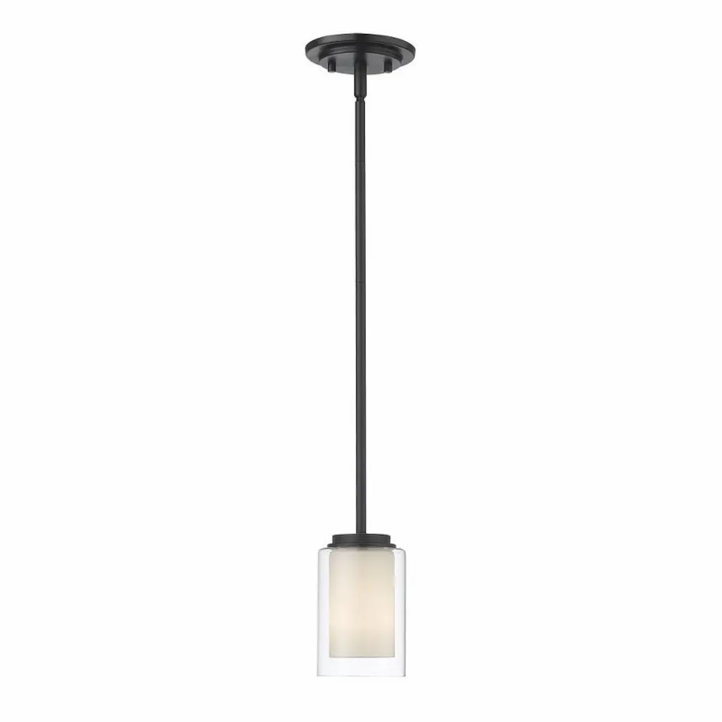 Give your dining room or bedroom a chic, sophisticated update. This beautiful, matte black mini pendant features a single glowing bulb beneath a delicate, glass shade that's white on the inside and clear on the outside. An exquisite lighting option to highlight your refined sense of style. Bedroom/Dining Room/Dinette/Kitchen/Kitchenette No. of Rods: 5 Shade Included: Yes Cord Length: 110.00 Rod Length(s): 12.00 Dimmable: Yes