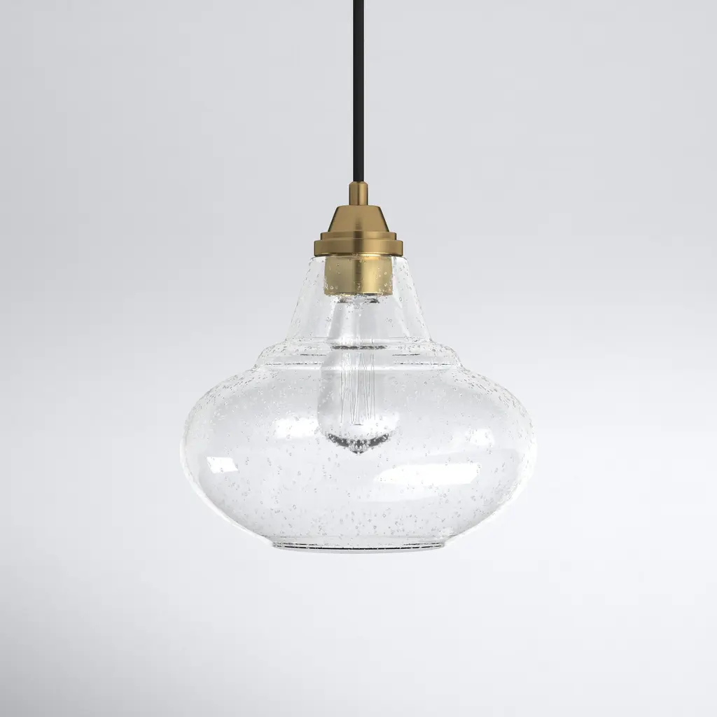 The Zen Blue Pendant is a transitional design composed of a transparent blue "Hour-Glass" shaped glass , with an interesting bubble pattern blown randomly throughout the glass The pleasing play of light through the shade's bubble accents makes for a striking affect, created by the exposed light source positioned inside the shade. The cord pendant fixture is equipped with a 10' SVT cordset and a low profile flat monopoint canopy. These stylish and functional luminaries are offered in a beautiful Black finish.