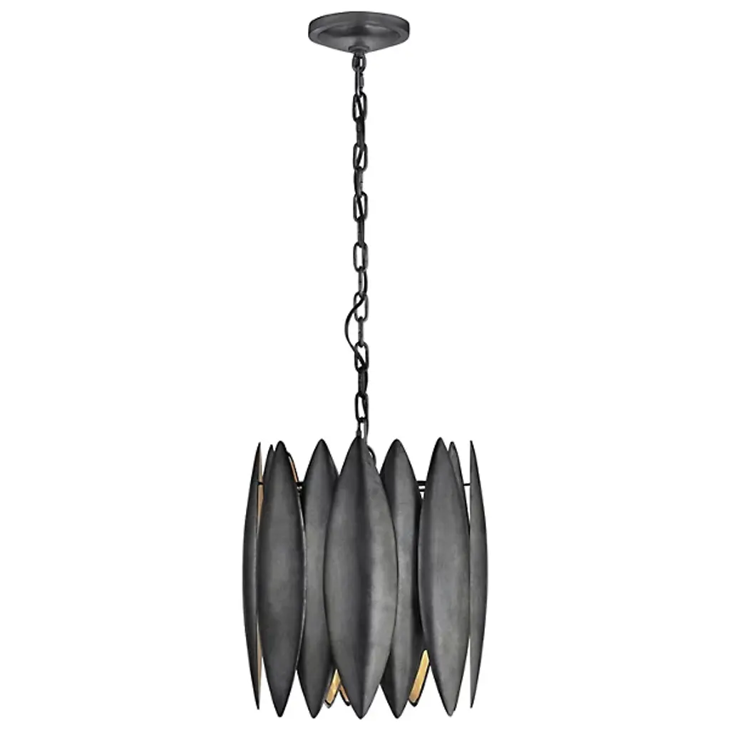 Like the ancient flow of a silk sleeve to block the sword of an aggressor, the movement and flow of the Zen Pendant's wide steel swirl is mesmerizing. The hand-forged and textured steel glows from the lights within, allowing them to play across the hand-shaped metal's interior surface. The work of Vermont artisans is palpable in this stunning and substantial piece.