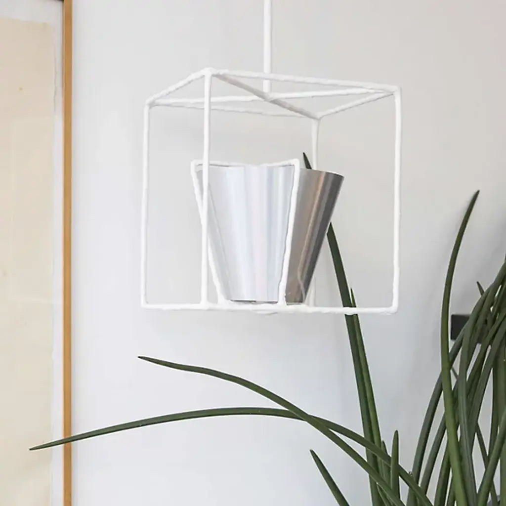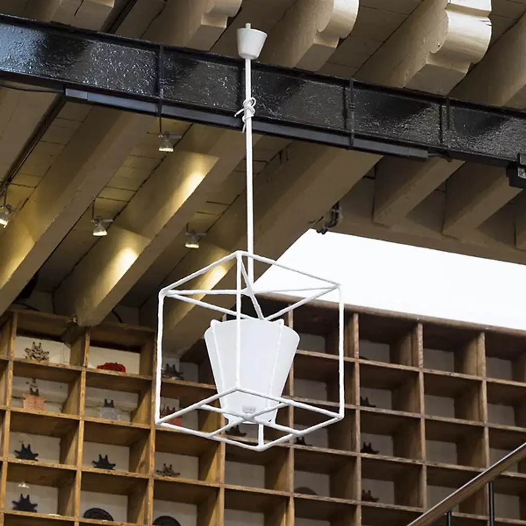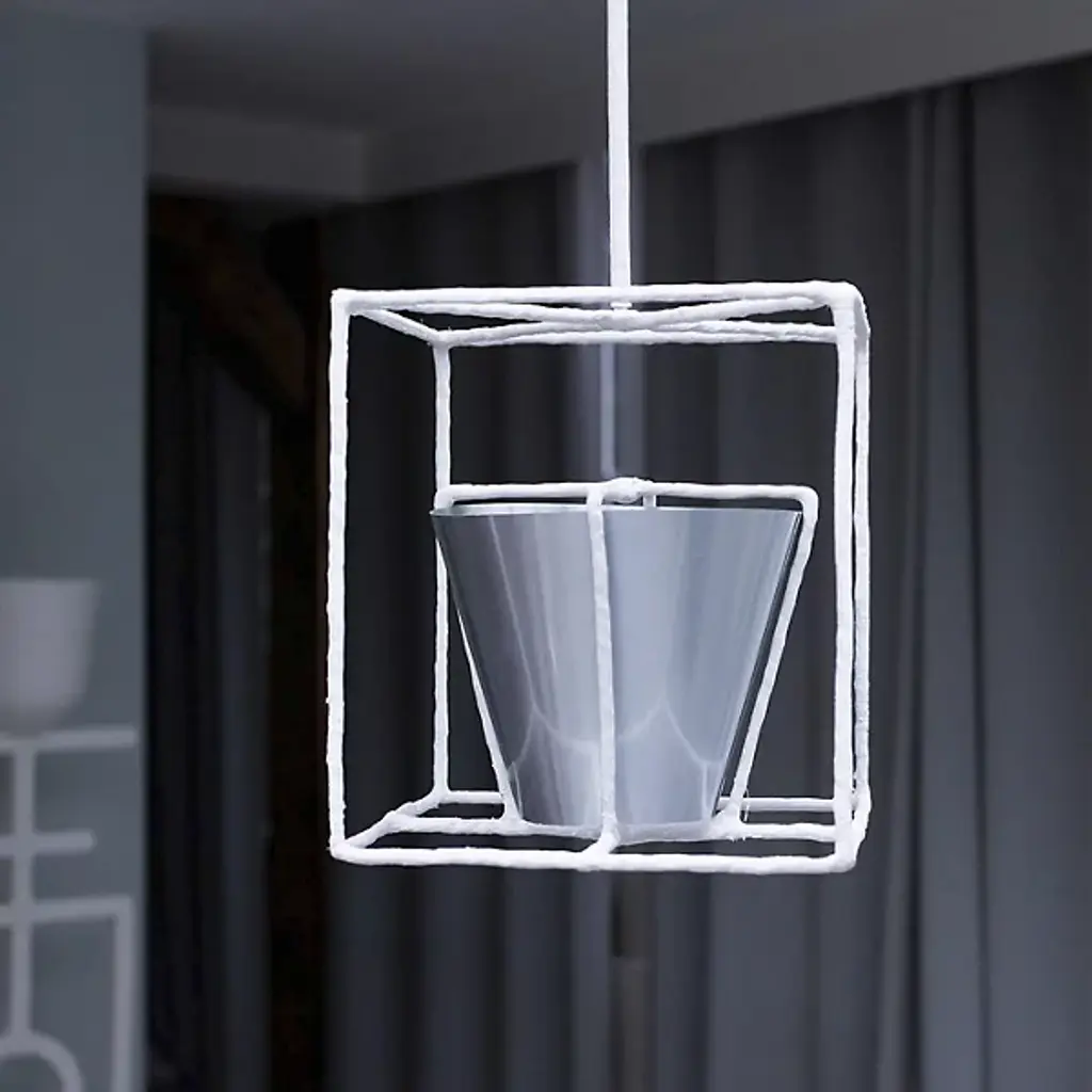 The Zenox Simple Pendant from Mathieu Challières uses a minimalist form, rustic texture, and an open linear structure to create a stylized column of light. Designed by Mathieu Challières, it embarks on a “Stylistic exercise on the ability of an object to combine with itself.” A composite box frame descends from a slender stem, placing central lighting inside an inverted conical shade at its center, casting a wide wash of reflected light upwards, and spilling a focused beam below.