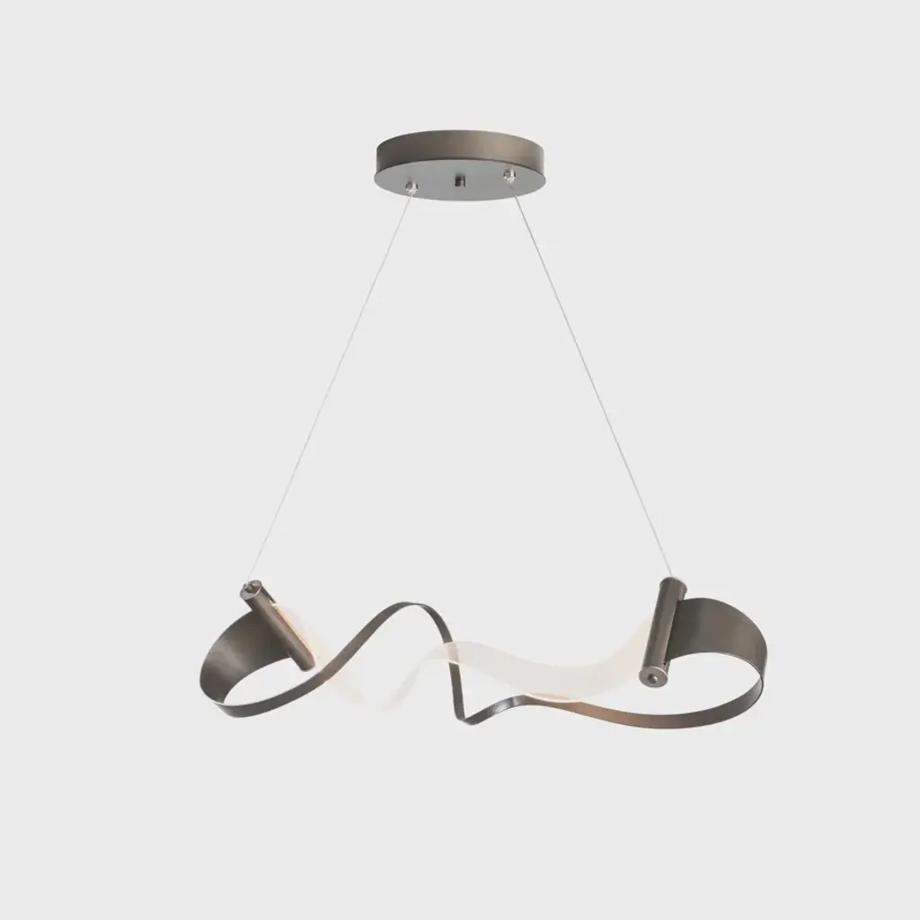 A continuous ribbon of hand-forged iron which morphs into a light guide and back again illustrates an elegant flowing form in the Zephyr LED Pendant by Hubbardton Forge. This pendant shows that the relationship between two opposing elements can come together to form one singular entity that illuminates your surroundings like no other. Beauty truly is in the details of the Zephyr design.Hubbardton Forge lighting is handcrafted in Vermont, USA by highly skilled artisans. Every lamp is made-to-order and handmade using environmentally friendly metal forging techniques. Powder coatings and aqueous metal cleaning are used in the production of every lamp. Shown in dark smoke finish