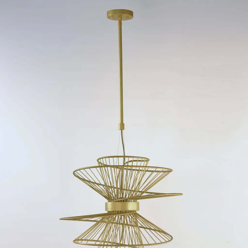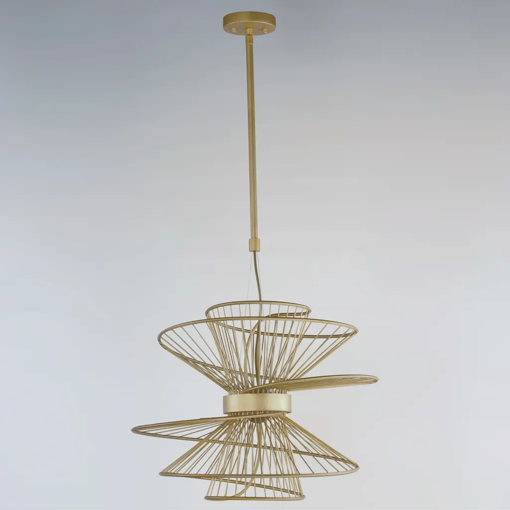 A geometrical marvel of design and craft, the Zeta collection's abstract form seemingly twirls as if in movement. An elusive orb of clear glass casts light both up and downward through indelicate steel spindles in your choice of Natural Aged Brass, Matte Black or Matte White creating a remarkable filigree of light. Available in multiple sizes of pendants, a ceiling mount, and an ADA wall sconce, this collection of products serve as the ultimate focal point of a room.