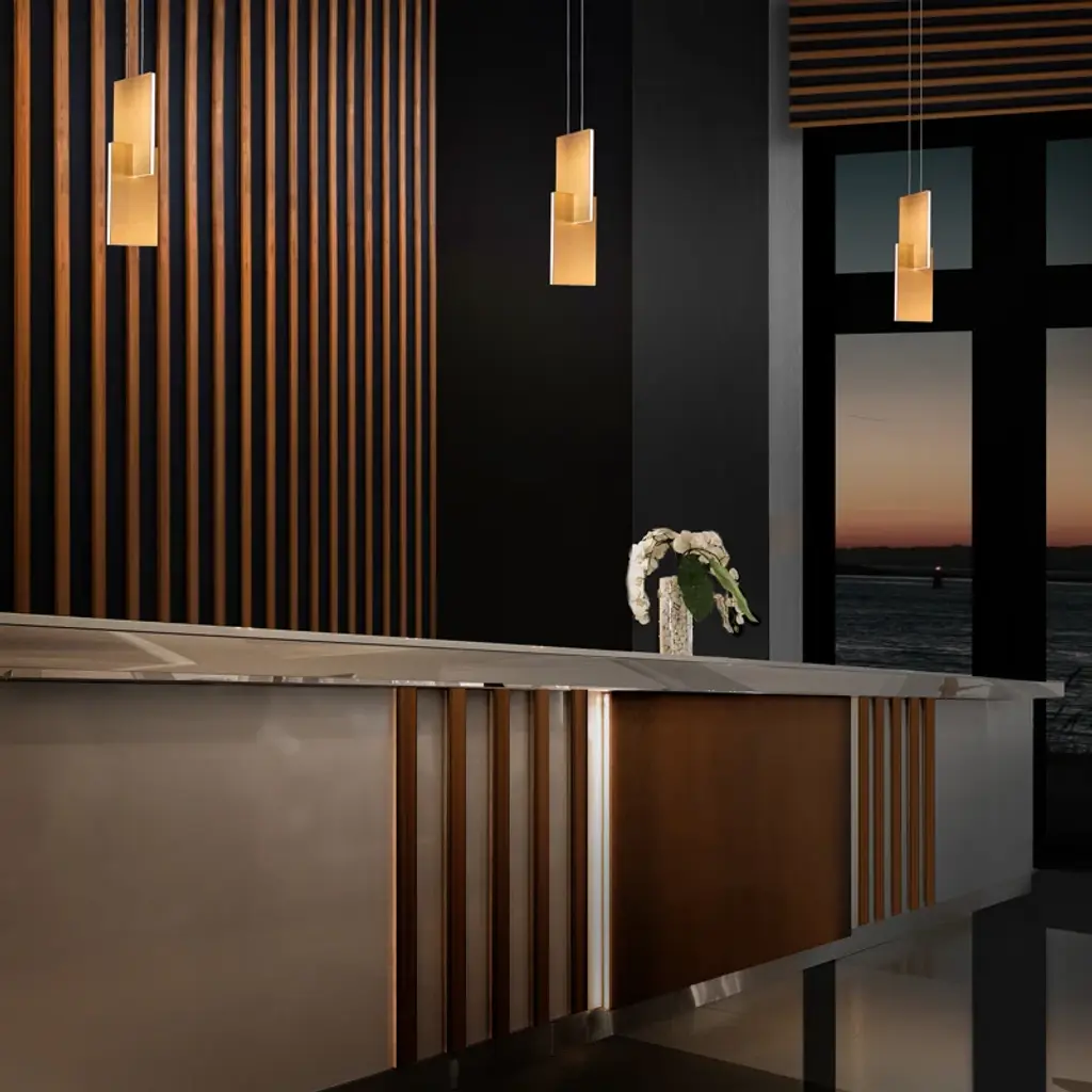 The Zhe pendant 4 is inspired by a wood from the orient that is hard as a rock. The metal lampshade is meticulously and deliberately hand welded together to resemble a cluster of rocks. Look closely and notice how each metal plate is a bit asymmetrical yet they all fit seamlessly together. Wooden stoppers under each frosted diffuser not only introduce warm elements of the wood, but functionally they soften up the overall light source. Zhe pendant 4 exemplifies subtle illumination on a grand scale.