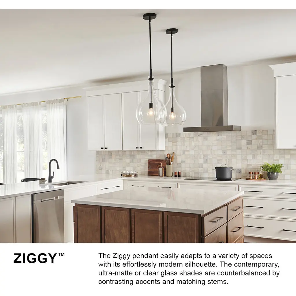 The Ziggy pendant easily adapts to a variety of spaces with its effortlessly modern silhouette. The contemporary, ultra-matte or clear glass shades are counterbalanced by contrasting accents and matching stems.