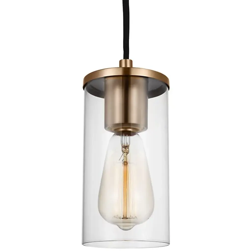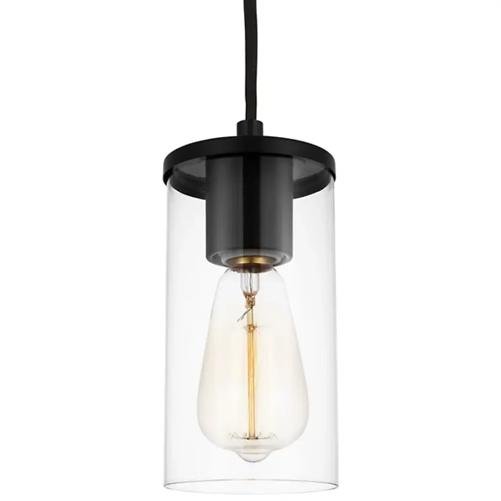 The Zire Mini Pendant by Visual Comfort Studio, formerly known as Sea Gull Lighting, is an elegant and minimalistic piece. A Clear Glass cylindrical shade descends from a simple cord and surrounds a single exposed bulb for an Edison-inspired design that has a crisp and clean silhouette. Lending a warm layer of light to surroundings, this contemporary pendant has some industrial flair and is capped with a slim Metal top. Blending form and function, this tailored piece makes a statement when placed in a linear arrangement.