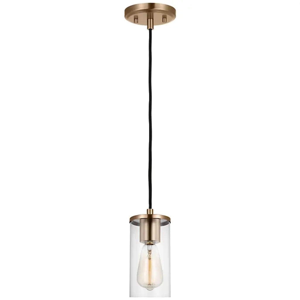 The Zire Mini Pendant by Visual Comfort Studio, formerly known as Sea Gull Lighting, is an elegant and minimalistic piece. A Clear Glass cylindrical shade descends from a simple cord and surrounds a single exposed bulb for an Edison-inspired design that has a crisp and clean silhouette. Lending a warm layer of light to surroundings, this contemporary pendant has some industrial flair and is capped with a slim Metal top. Blending form and function, this tailored piece makes a statement when placed in a linear arrangement.
